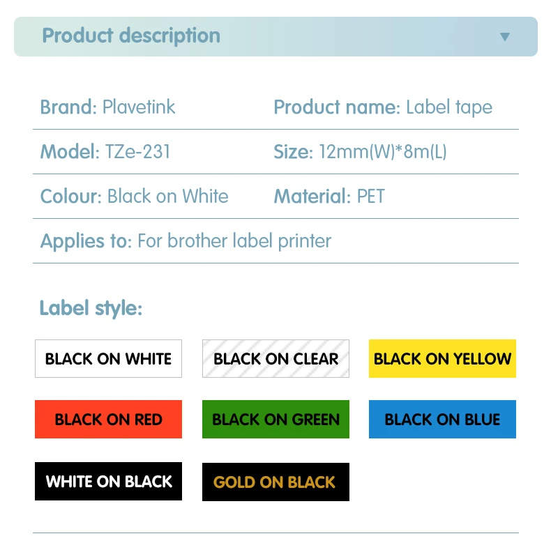 Plavetink TZe231 TZe-231 Tze 231 tze231 совместимый для принтера Brother P-touch tze лента 12 мм производитель этикеток PT 100 PT D200