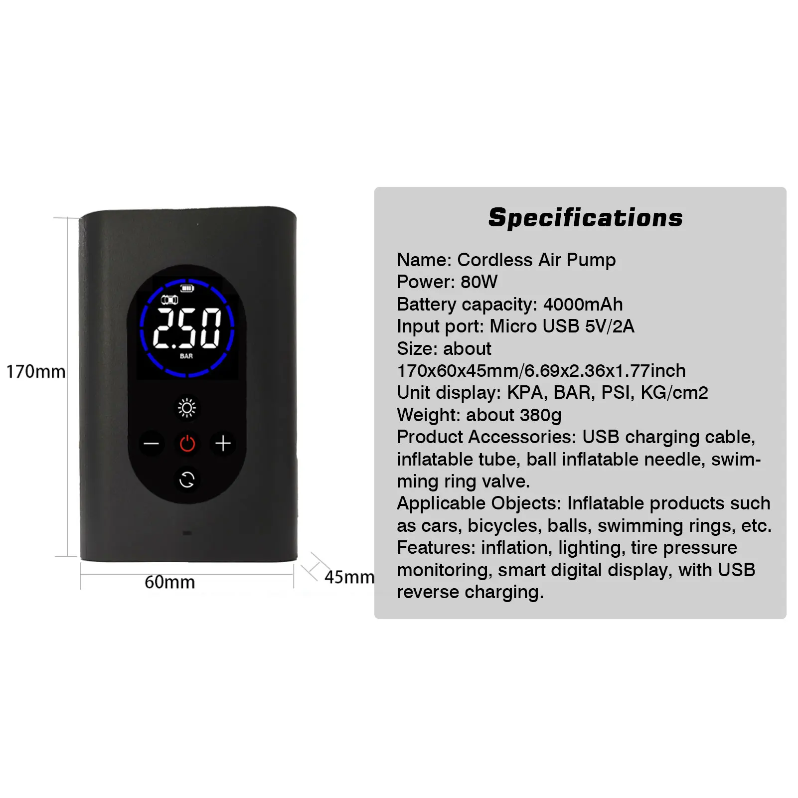 1. Разработан электрический портативный насос! Перед первым использованием насоса внимательно прочитайте это руководство по эксплуатации.2. Данный продукт разработан для экстренной прокачки шин высокого давления, используемых в велосипедных международных соревнованиях. Также подходит для накачивания обычных велосипедов, автомобилей, мотоциклетных шин, мячей, надувных игрушек и других развлекательных и туристических товаров.