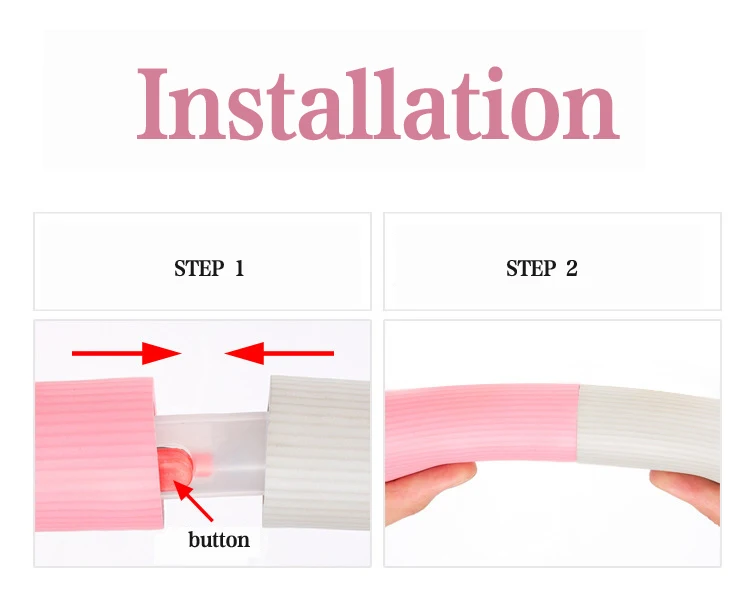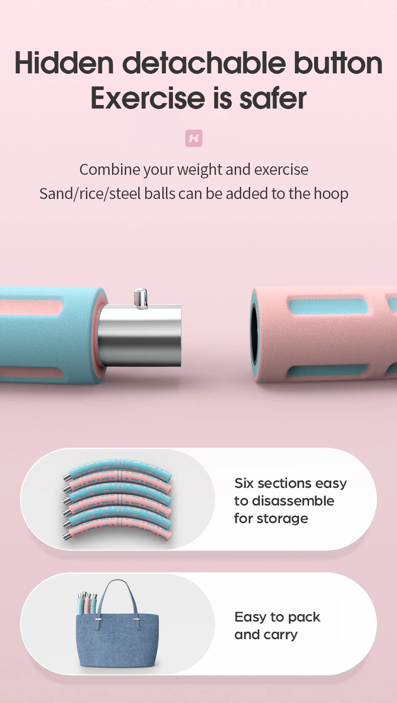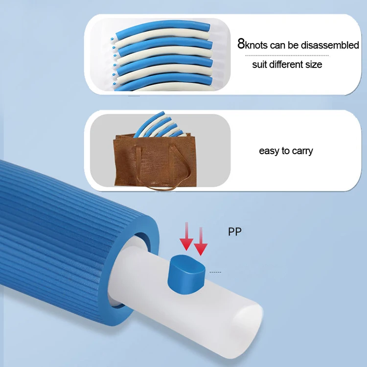 Диаметр: около 90 см Характеристики: Съемный в 6 частях Материал: трубчатая сталь + пенопласт NBR, очень устойчив к растрескиванию Шаги установки стальных труб Метод установки первого раздела: ①. Ламинат двух насадок вверх и вниз. ②. Одна секция зафиксирована, поверните другую секцию и слегка нажмите на середину. ③. Вращайте, когда штык секции 2 полностью выровнен, трубка автоматически вставляется в деталь. ④. Нажмите на выпуклую точку трубки и продолжайте вставлять ее, и 2 секции закрываются щелчком. ⑤. Потяните следующие 2 трубы, чтобы проверить, является ли установка твердой, и продолжайте устанавливать следующую секцию в соответствии с этим методом. Способ установки в последней секции: Положите обруч хула в вертикальном положении на землю, расстегнув 2 секции сверху, возьмите 2 секции и аккуратно прижмите их вниз. Когда насадки 2 секций выровнены, вы можете вставить их.