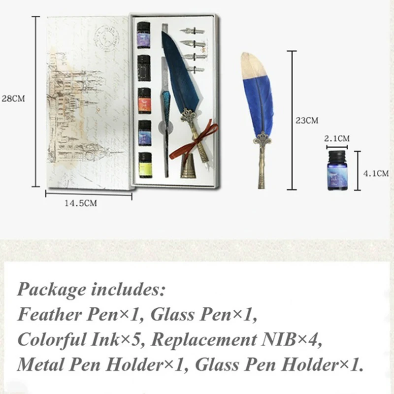 Retro feather pen * 1, replacement pen tip * 4, metal pen insert * 1; crystal glass pen *1, crystal glass pen holder *1, color ink * 5