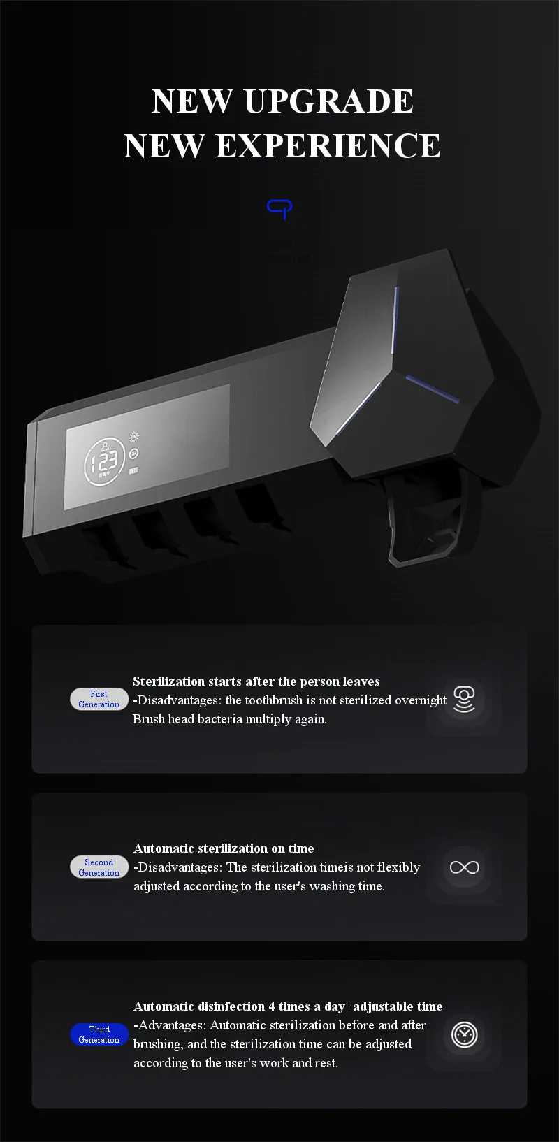 -Встроенный инфракрасный сенсор, когда рядом с держателем зубной пасты, функция стерилизатора перестает работать, и она начинает работать, когда вы уходите, чтобы обеспечить безопасное использование.