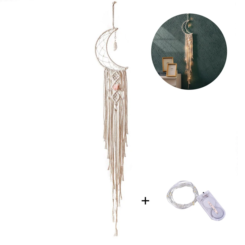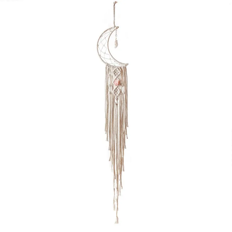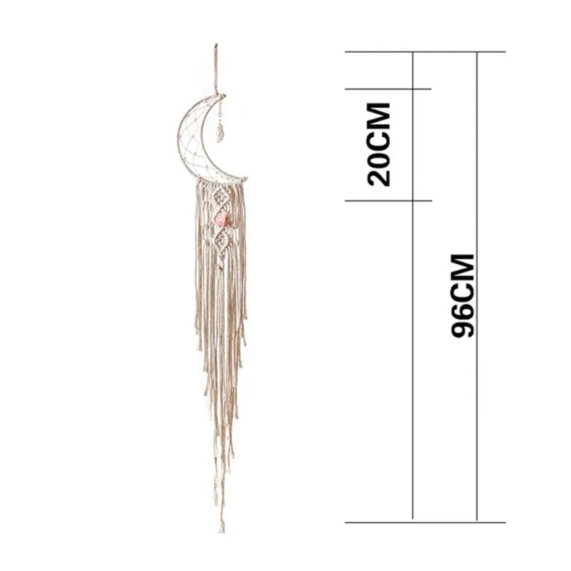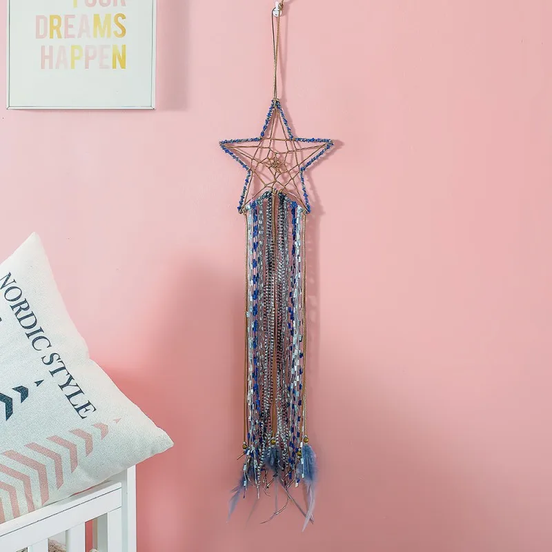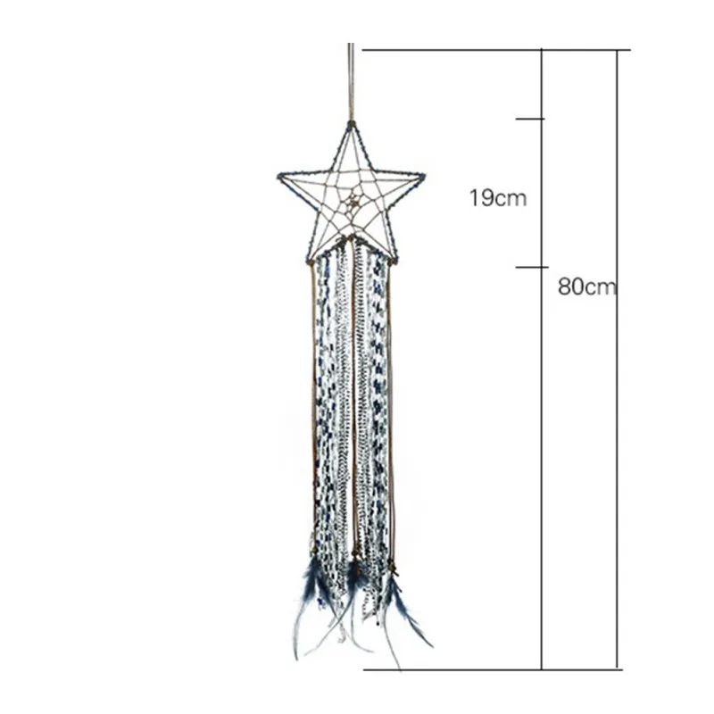 1. Оригинальный дизайн, ручная работа, каждая деталь гобелена полна любви. Форма Луны и форма звезды металлического круга разработаны с ретро звездами, натуральными сине-серыми перьями, деревянными бусинами, подвеской из хрустального камня и высококачественной нитью, которые являются изысканными и красивыми. Вам понравится этот Синий Ловец снов.