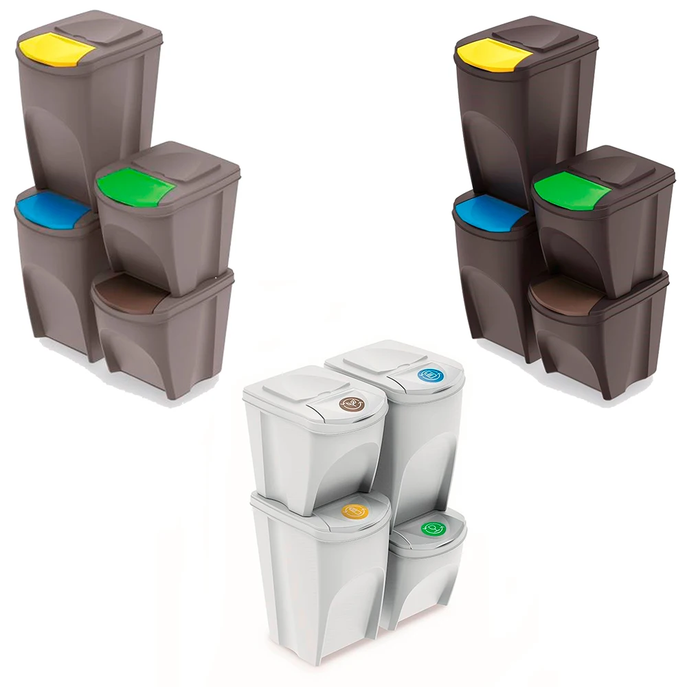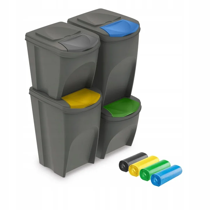 Набор из 4 кубиков рециркуляции различных цветов 25 литров и 35 литров для бумаги, стекла, пластика и органики.