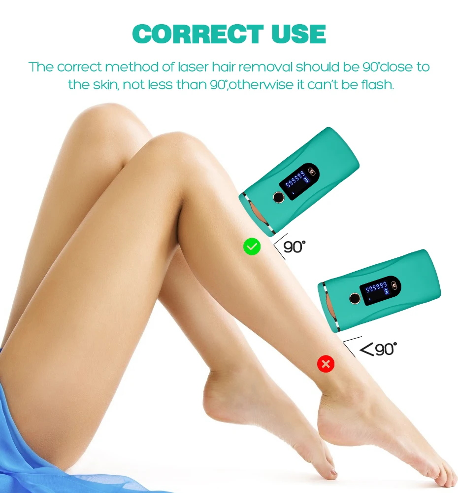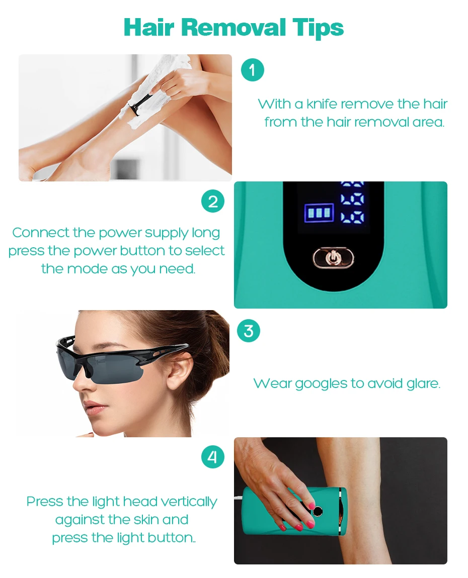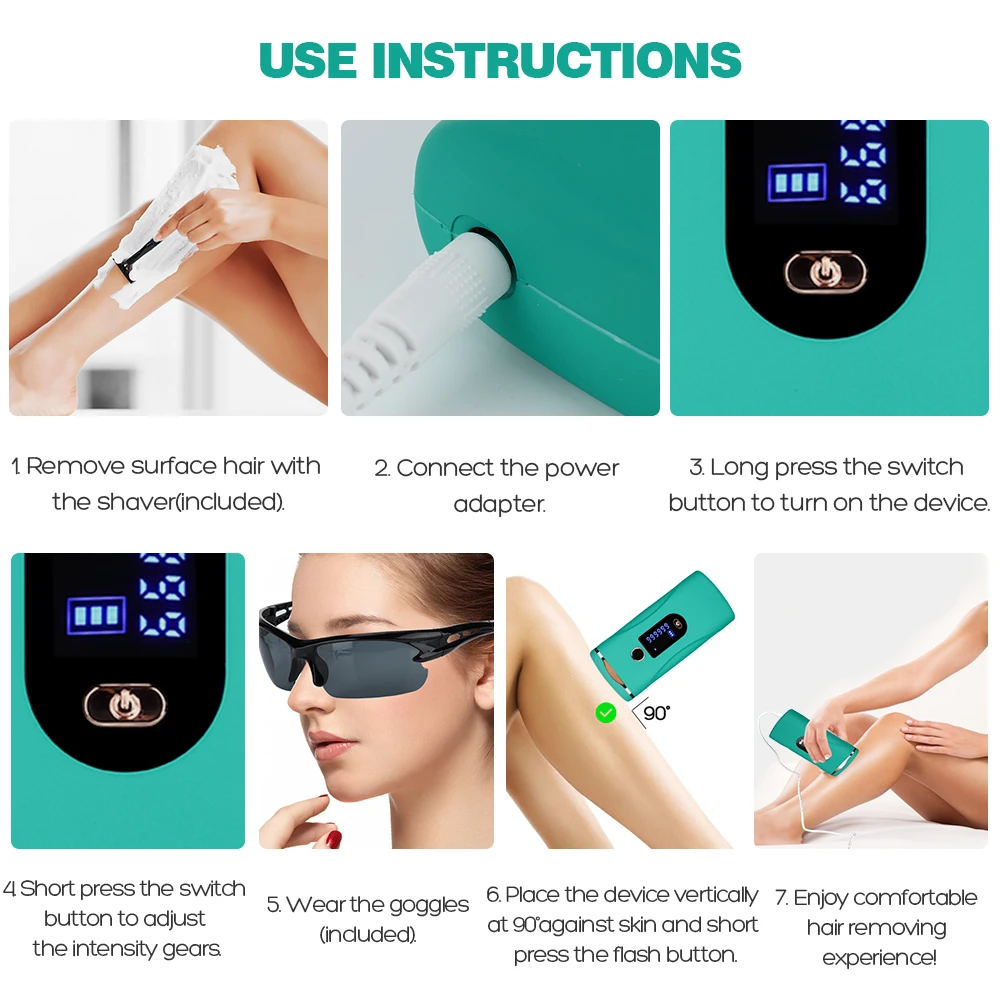 1) Очистите фильтр головки устройства мягкой тканью. 2) Намочите волосы и удалите их бритвой. 3) Подключите адаптер питания. 4) удерживайте кнопку включения до тех пор, пока дисплей не будет включен. 5) Когда дисплей включен, устройство готово. 6) Наденьте очки и нажмите кнопку переключения для регулировки интенсивности передач. 7) нажмите устройство на кожу вертикально при 90 °, чтобы убедиться, что кожа находится в полном контакте. 8) нажмите кнопку вспышки, чтобы отправить вспышку (если температура слишком высокая, это означает, что выбранная вами передача слишком высока. Настоятельно рекомендуется начать с первой передачи). 9) после того, как устройство отправит вспышку, измените положение депиляции, чтобы справиться с нужной частью. 10) нажмите кнопку включения, чтобы выключить устройство и выключить источник питания.