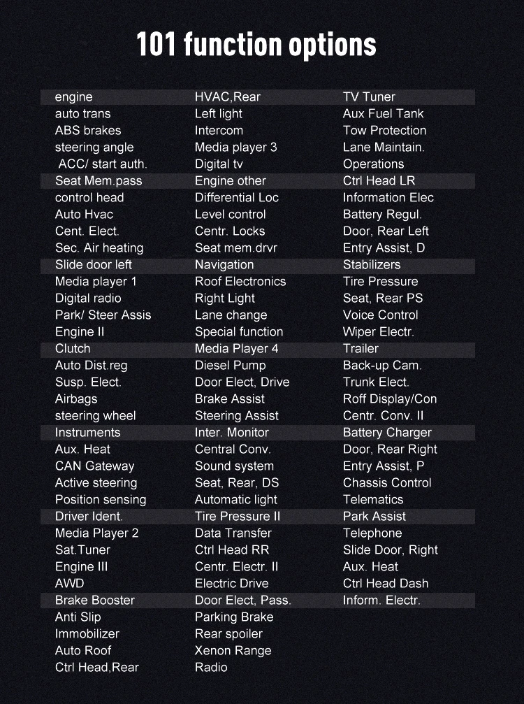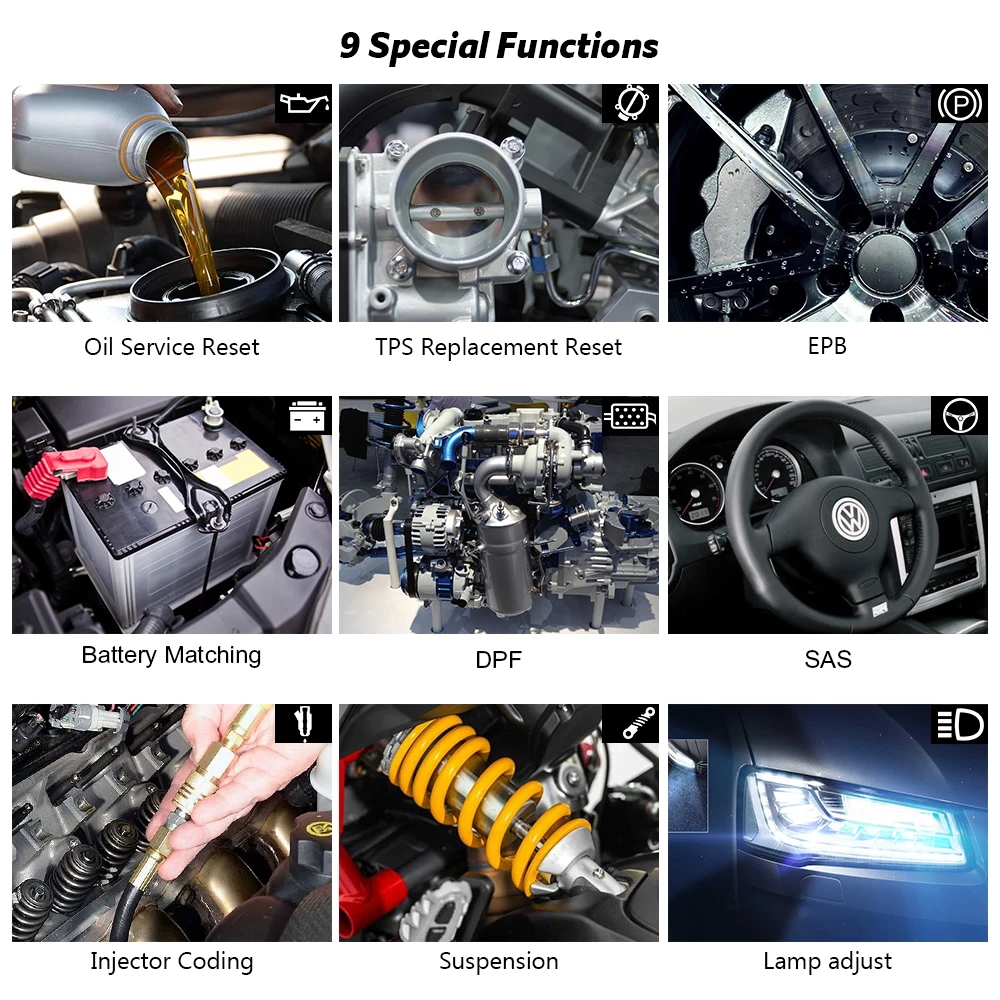 Он способен диагностировать электронную систему управления транспортных средств серии VW AUDI SEAT SKODA, включая силовой поезд, шасси, информацию об кузове транспортного средства, кондиционер и другие системы. Функции, меню и рабочий шаг такие же, как и оригинальный декодер. Он также имеет специальные функции для VW AUDI SEAT SKODA, включая сброс масла/сброс EPB/DPF/ BAT Match/ SAS/спичка дроссельной заслонки/Регулировка подвески/лампы. Для автомобилей других брендов obd2 он способен считывать и стирать код неисправности двигателя и выключать индикатор неисправности двигателя.