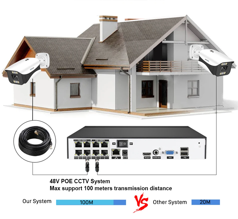 Наборы PoE NVR используют усовершенствованное Сжатие видео H.265, уменьшает 50% Размер файла и сохраняет такое же качество по сравнению с H.264.