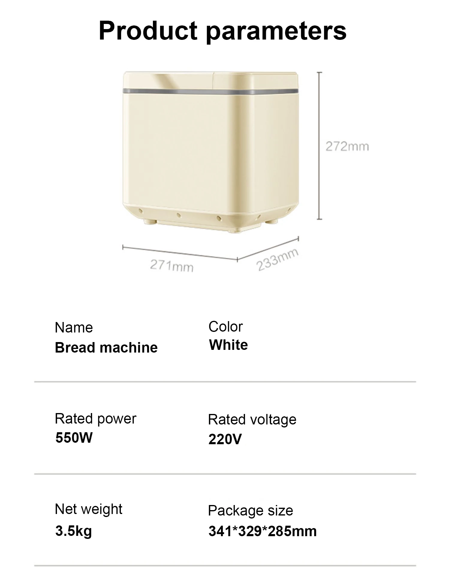 Название продукта: хлебопечкаНоминальное напряжение: 220 ВНоминальная частота: 50 ГцНоминальная мощность: 550 ВтНоминальная емкость: 500 г/750 гРазмер посылка: 341*329*285 мм