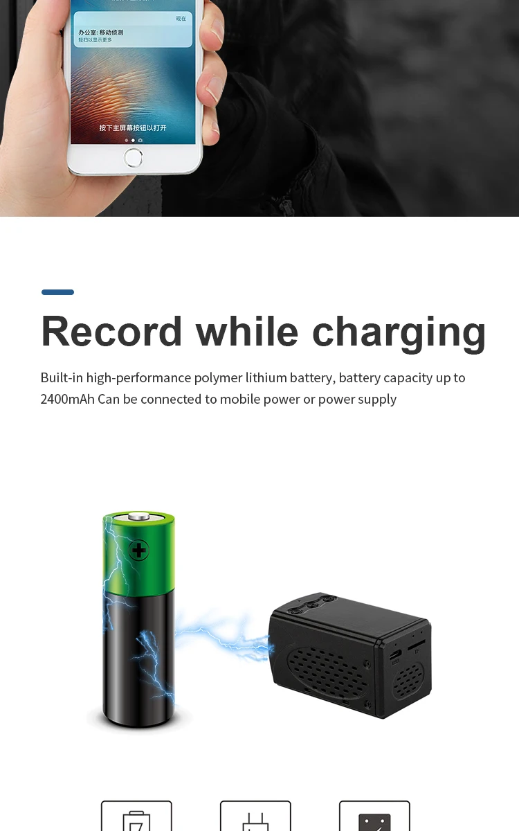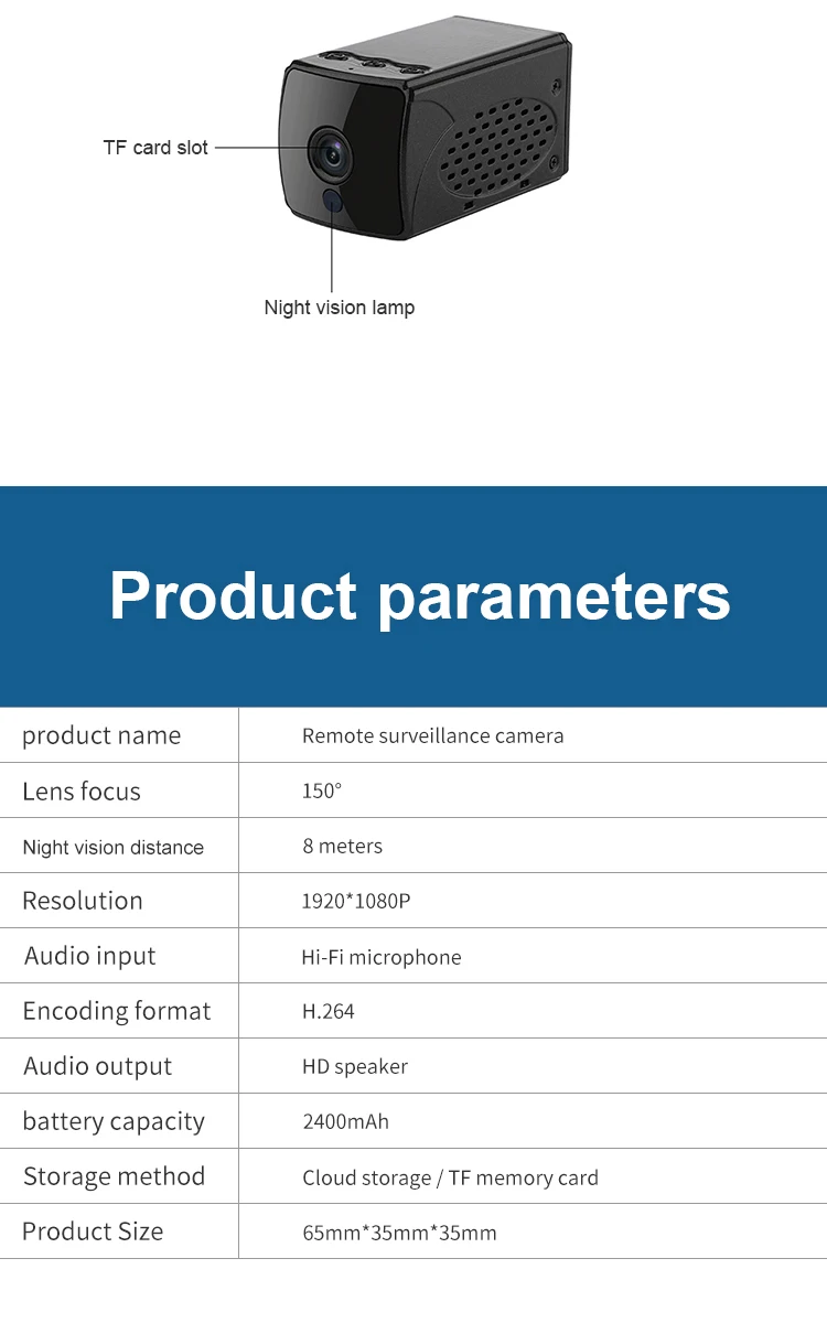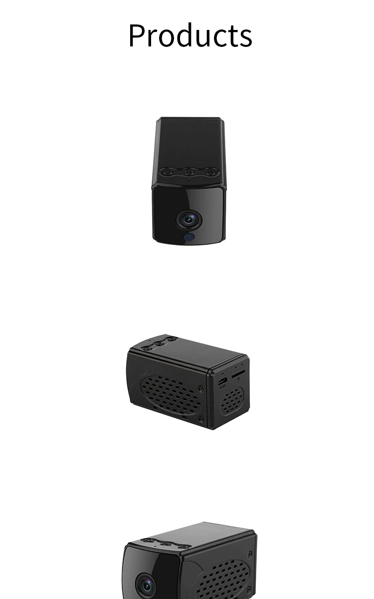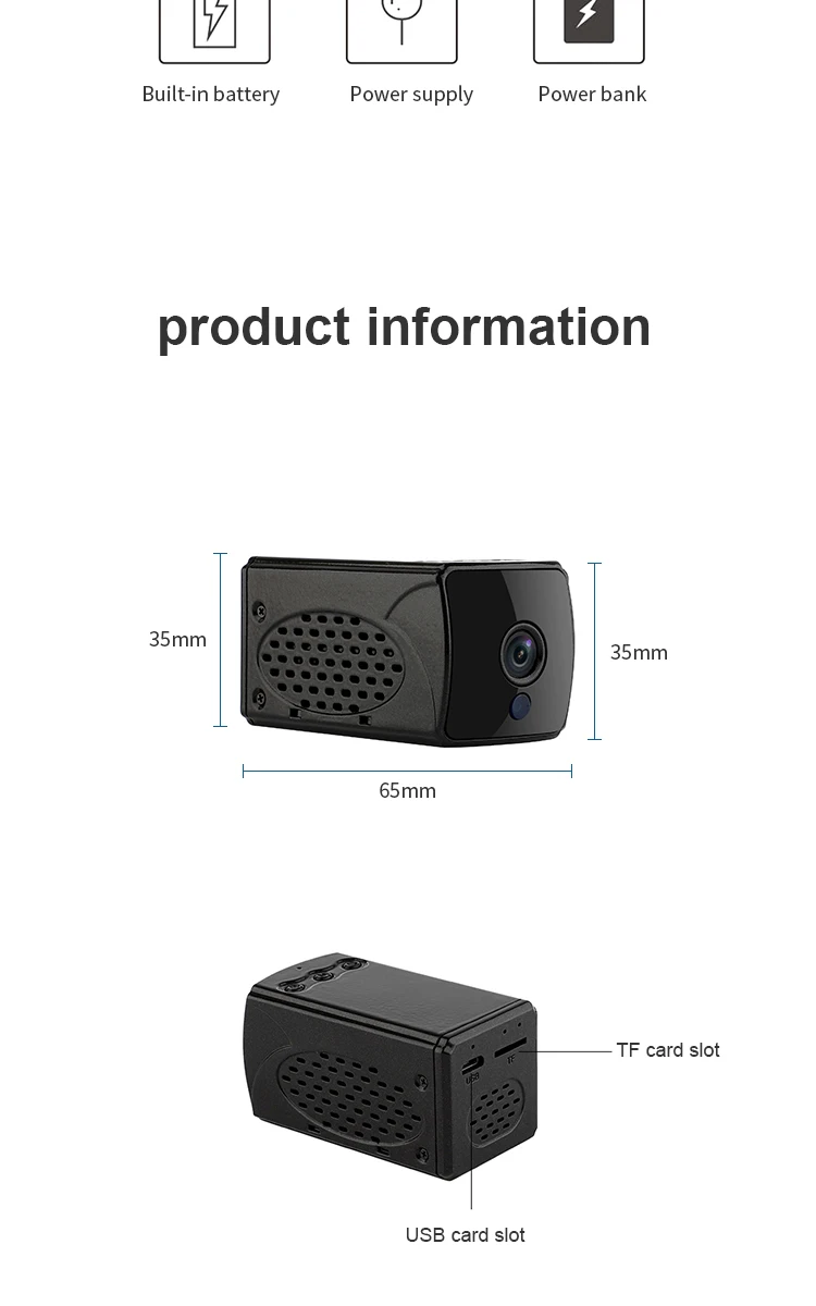 Характеристика: 1, последнее решение hayes, более высокая частота кадров, более низкое энергопотребление, лучшее определение, лучшее ночное видение, более стабильная скорость подключения WiFi 2, двусторонний голос, вызов 3. Обновите истинный широкий угол широкоугольного объектива до 150 ° 4. Обновление 4K и 2K режимов 5, обновление видео супер сжатие, высокое качество видео в то же время значительно уменьшает объем памяти 6. Поддержка облачных хранилищ 7. Обновите режим Wi-Fi точка-точка для дальнейшего проникновения 8. Сверхдлинная кобальтовая батарея с большой емкостью может достигать более 6 часов 9, высокое качество 6 стеклянных линз Настоящее 1080P hd видео 10. Поддержка карты памяти 128G 11. Встроенная точка доступа WiFi может использоваться без сети 12, сильная Магнитная Адсорбция сильного ночного видения Спецификация: Материал: АБС-пластик Цвет: черный Разрешение: 1920*1080P Фокус объектива: 150 градусов Расстояние ночного видения: 8 м Аудио вход: Hi-Fi микрофон Аудиовыход: динамик HD Формат кодирования: H.264 Съемка камеры с датчиком движения: 6 метров Операционная система компьютера: Windows / Mac OS X. Мобильная операционная система: Androi-d / i-OS Память: карта Micro SD с внешней картой памяти, до 128 г (без sd-карты) Формат видео: AVI Батарея: 3,7 V, 2400mAh Вход: 5V, 1A Размер изделия: 65*35*35 мм Посылка включает: 1 * Мини wifi камера 1 * Инструкция по эксплуатации 1 * USB кабель для передачи данных 1 * магнитное основание