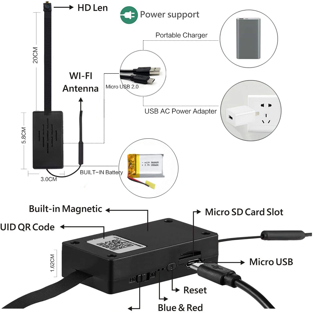 Примечание: Это может быть немного Горячая при выполнении работ для этой камеры, так как она не имеет защитный чехол на устройстве, но, пожалуйста, примите во внимание, не волнуйтесь, мы можем обещать, что это не выходит за пределы нормы и 100% безопасный 。 Это сетевая камера. Нет ограничений на расстояние для просмотра или записи видео в режиме реального времени после завершения конфигурации сети в вашем смартфоне в режиме P2P. Вы можете просматривать или записывать видео в реальном времени в любое время. Особенности: Запись аудио и видео в реальном времени WiFi IP Сетевая функция Поддержка приложения для смартфона и планшета Угол обзора объектива 90/120 градусов Поддержка записи детектива движения Поддержка карт Micro SD на 128 Гб (sd-карта не входит в комплект) Круглое хранилище Встроенный Батарея Ёмкость Около 2 часов работы батареи Поддержка записи и зарядки одновременно Параметры: Формат видео: avi Угол обзора объектива: 90 градусов/120 градусов Микрофон: Встроенный Память: поддержка 128 ГБ Micro Card in Max Мин. Освещение: 0,1 люкс Время работы аккумулятора: 2 часа Температура хранения: -20-80 градусов по Цельсию Рабочая температура: -10-60 градусов по Цельсию Рабочая влажность: 15-85% относительной влажности Тип карты памяти: tf-карта Операционная система смартфона: iPhone iPad или Android Напряжение зарядки аккумулятора: 5 В постоянного тока 1. Обеспечить достаточное количество электроэнергии для продуктов серии WiFi с большим энергопотреблением. Обязательно помните, что он должен использоваться после полной зарядки; Недостаточное количество электроэнергии приведет к плохой связи, сбою при поиске сигнала, частым отключениям и нестабильному видео и т. д. Таким образом, если вы столкнулись с проблемой, указанной выше, пожалуйста, зарядите устройство и повторно запустите его после зарядки. Шаг решит все проблемы. 2. Никогда не смотрите видео, открывая мобильное программное обеспечение. Перед открытием программного обеспечения убедитесь, что вы уже подключили устройство Wi-Fi. В противном случае вы не сможете нормально смотреть видео.