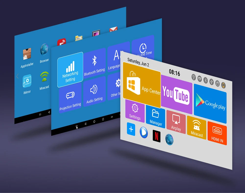 Проектор основан на ОС Android, чтобы настроить рабочий стол для большего экрана. Вы загружаете все виды приложений через Google play.