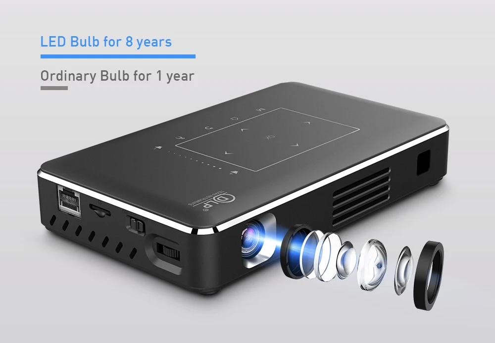 Проектор имеет носимых, стеклянные линзы с покрытием и высокого качества светодиодный лампы, что гарантирует, что экран яркий, стабильная и светильник срок автономной работы до 20000 часов.