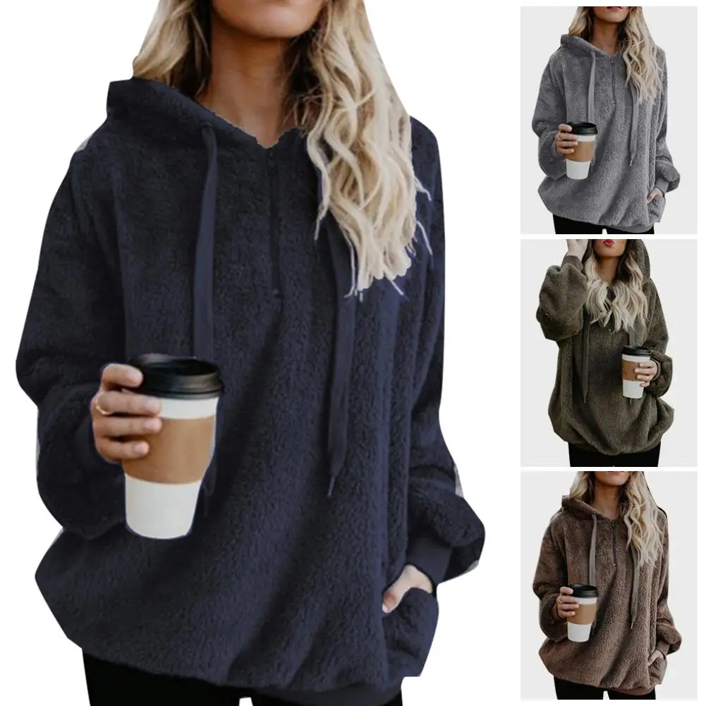 Зимняя толстовка с капюшоном размера плюс однотонная 1/4 пушистая толстовка на молнии Женская Осенняя Повседневная теплая куртка