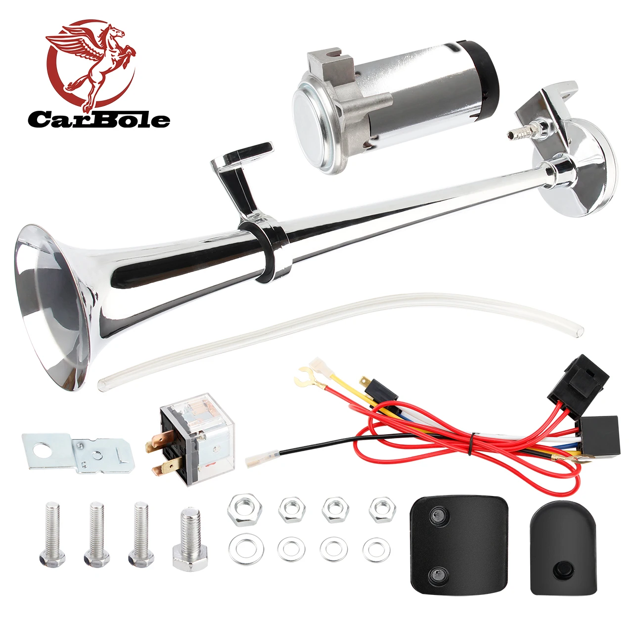 -Изготовлен из металла, обеспечивает максимальную прочность и долговечность для длительного использования. -С отполированным красным воздушным насосом и блестящим хромовым рожком они придают яркий внешний вид любому установленному автомобилю. -Предназначен для клиентов, которые ищут громкий и доступный воздушный рожок. -Этот вагон может поместиться в большинстве транспортных средств, но доставит Вам большой звук. -Простота установки. Комплект рога включает в себя основное монтажное оборудование и шланг.