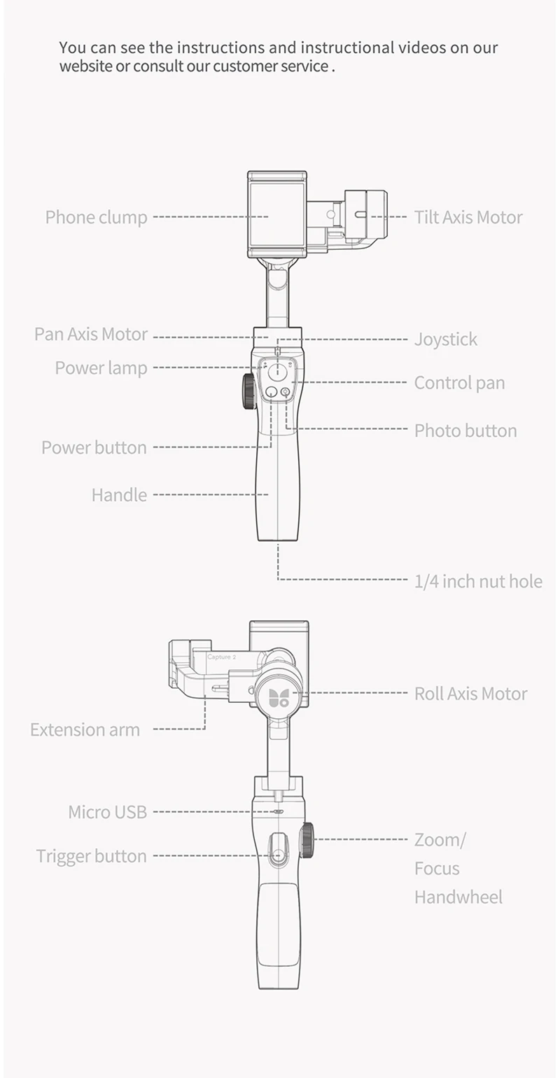 * Специальная конструкция-кнопка запуска, карданный подвес быстро вернется к середине при двойном щелчке кнопки запуска, длительное нажатие