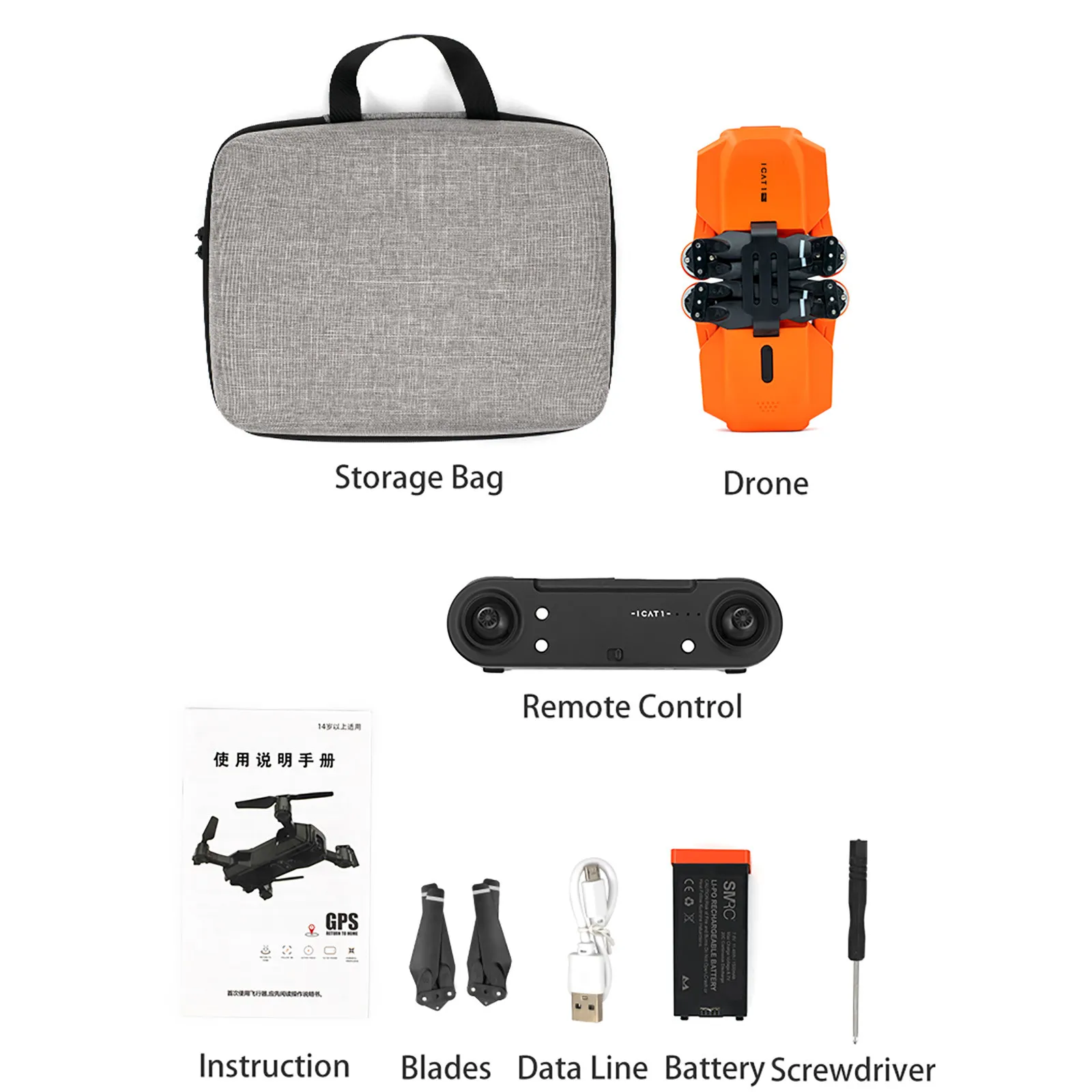 1 Дрон UAV 1 пульт дистанционного управления 4 запасных лезвия 1 х USB кабель для зарядки 1 х болт-драйвер 1 х сумка для хранения