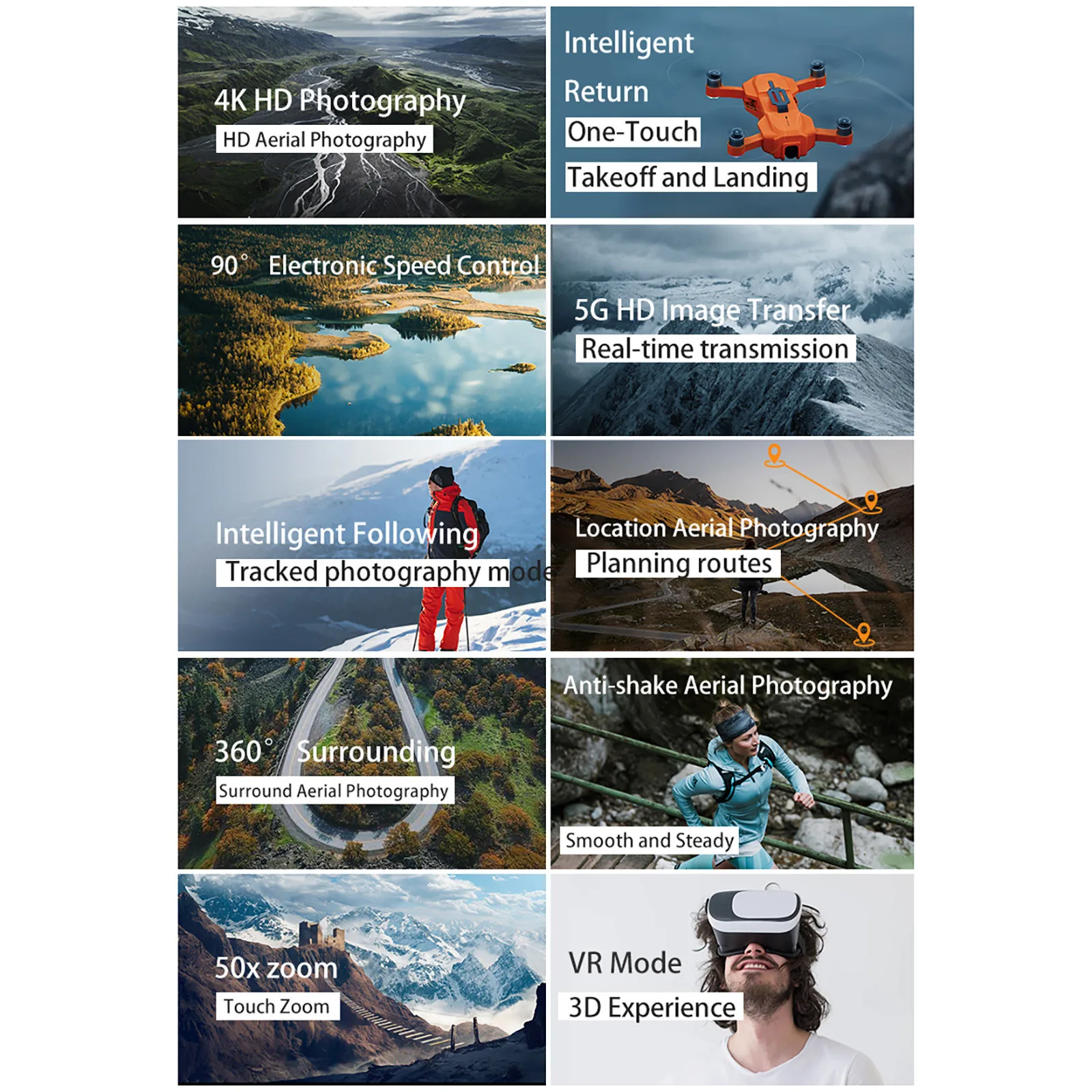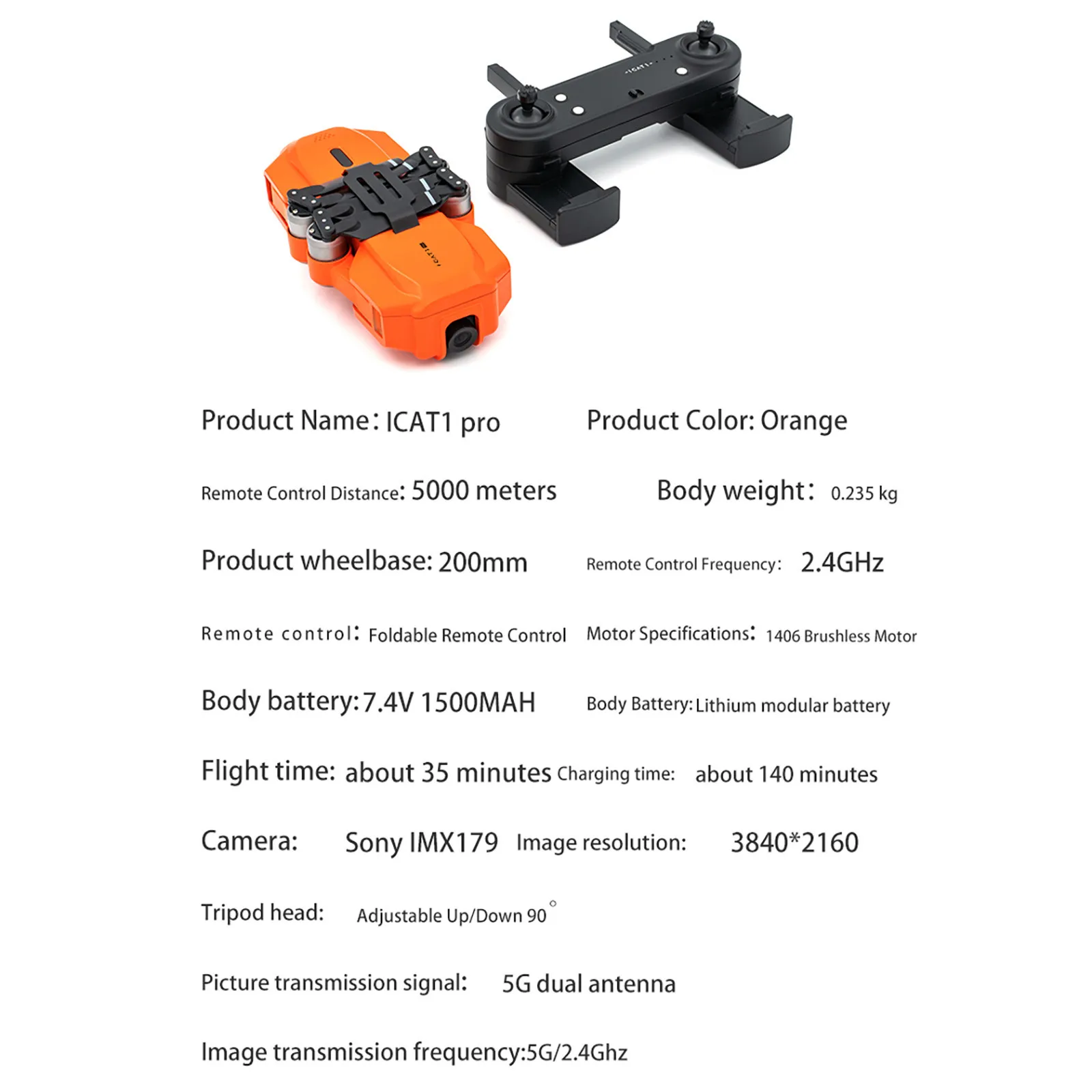 1. Пульт дистанционного управления может Отрегулируйте угол камеры вверх и вниз и непрерывно регулируйте 90 градусов вверх И вниз; 2. WiFi 120 градусов Широкоугольный HD, 4K пикселей, 3840x2160p, передача в реальном времени: 30fps, WiFi Расстояние передачи изображения: 300-500 м; 3. WiFi камера может принимать Фотографии и видео с мобильный телефон/пульт дистанционного управления; 4. Складной дизайн Продукт и пульт дистанционного управления делают хранение более удобным 5. Micorusb используется для Зарядка, которую можно заряжать с помощью кабеля для зарядки Android В любое время; 6. Аккумулятор принимает модульный Дизайн, который удобен для пользователей, чтобы купить больше электроэнергии и летать Долгое время.Описание: