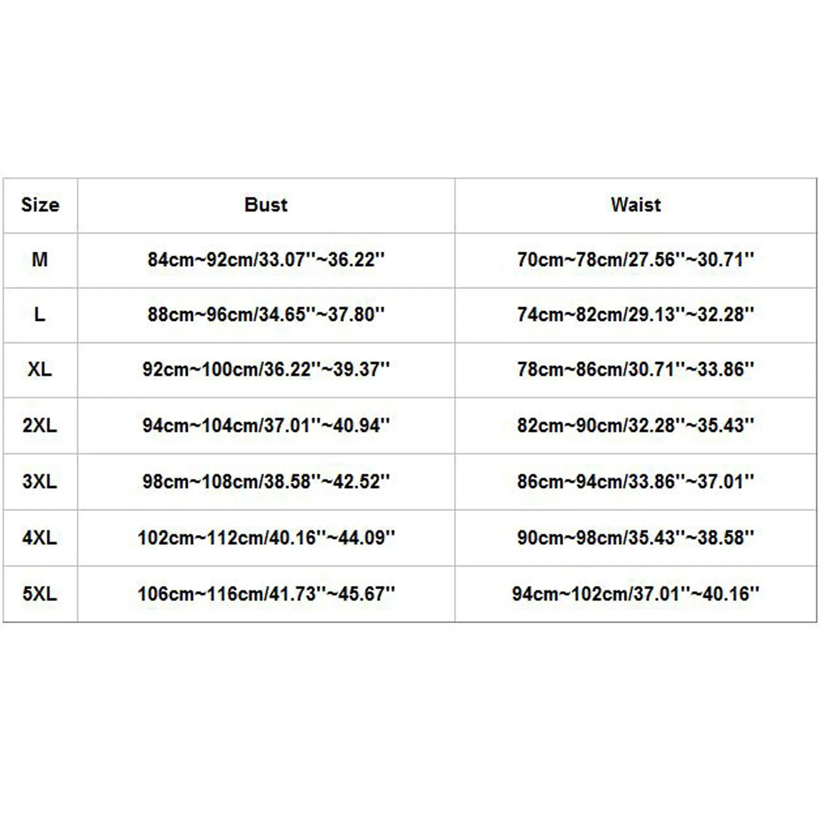 Размер Бюст Талия М 84 см ~ 92 см/33,07 ''~ 36,22'' 70 см ~ 78 см/27,56 ''~ 30,71'' L 88 см ~ 96 см/34,65 ''~ 37,80'' 74 см ~ 82 см/29,13 ''~ 32,28'' XL 92 см ~ 100 см/36,22 ''~ 39,37'' 78 см ~ 86 см/30,71 ''~ 33,86'' 2XL 94 см ~ 104 см/37,01 ''~ 40,94'' 82 см ~ 90 см/32,28 ''~ 35,43'' 3XL 98 см ~ 108 см/38,58 ''~ 42,52'' 86 см ~ 94 см/33,86 ''~ 37,01'' 4XL 102 см ~ 112 см/40,16 ''~ 44,09'' 90 см ~ 98 см/35,43 ''~ 38,58'' 5XL 106 см ~ 116 см/41,73 ''~ 45,67'' 94 см ~ 102 см/37,01 ''~ 40,16''Размер: M