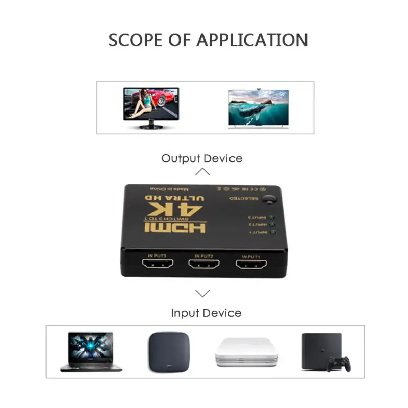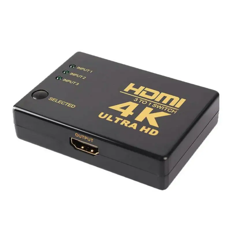 Переключатель 3 в 1-это небольшой высокопроизводительный переключатель. Уникальный дизайн и утонченный внешний вид. Несколько входов подключаются к нескольким hd-видео-источникам, таким как приставки PS3 и HD. Выход передает HD аудио/видео сигналы на HDTV. Он имеет хорошую совместимость, совместим с Blu-Ray DVD, satellite , PS3, Blu-Ray плеером, Xbox360. .. Разрешение до 1080P