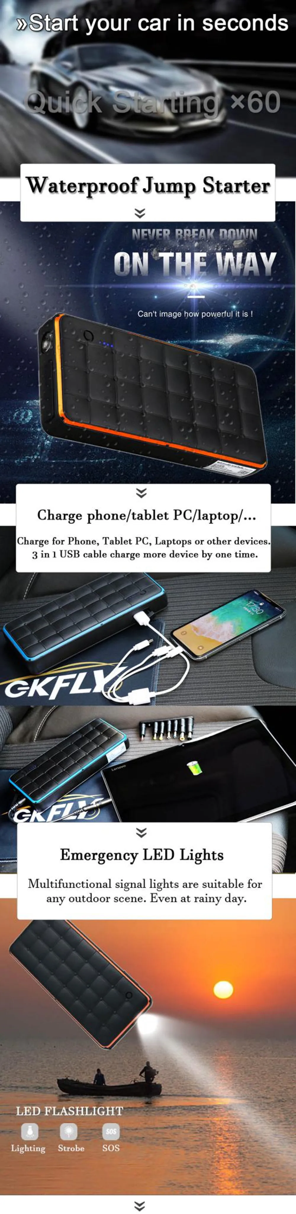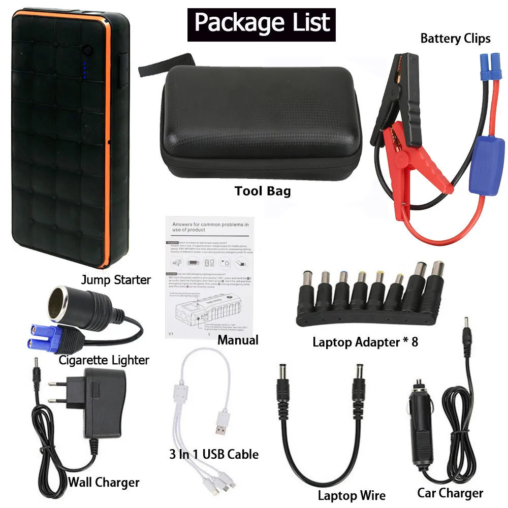 Это многофункциональный водонепроницаемый автомобильный пусковой механизм и мощный аккумулятор высокой емкости. Настоящий супер Внешний аккумулятор 28000 мАч-никогда больше не беспокойтесь о вашем смартфоне или планшете, работающем на низком заряде батареи. Водонепроницаемый уровень IP65-защитите стартер, вы можете использовать его в дождливый день, даже упасть в воду. 1000А пусковое устройство-для запуска всех 12 в бензиновых автомобилей и дизельных автомобилей всего за несколько секунд, когда батарея автомобиля мертва. SOS светильник-если вы находитесь на открытом воздухе в кемпинге и окажетесь в чрезвычайной ситуации, вы можете использовать сигнальный светильник SOS стробоскоп, чтобы привлечь внимание. Светодиодный светильник-использовать как фонарь со встроенной функцией светодиодный фонарь светильник.