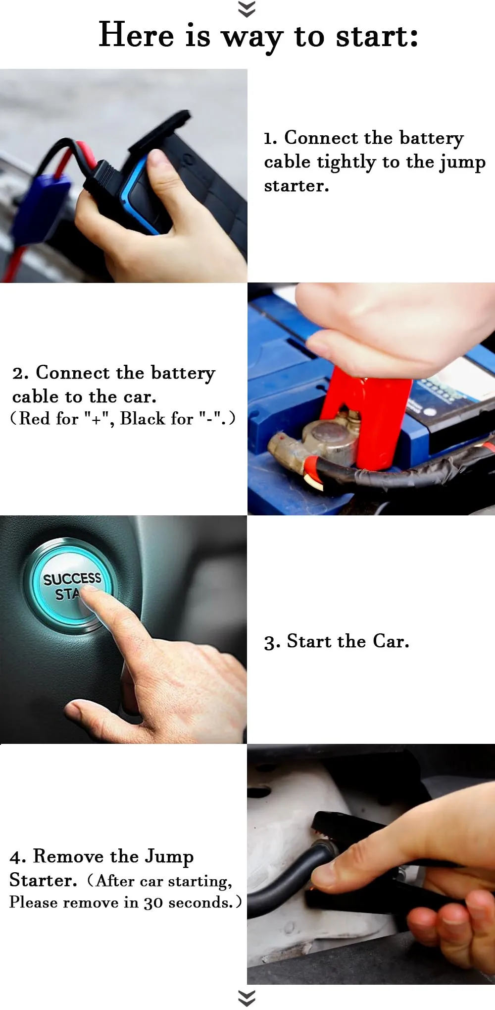 1. Для вашей безопасности, пожалуйста, не разбирайте стартер скачка. После демонтажа самостоятельно, мы не будем обслуживать любые возникшие проблемы. 2. Перед запуском двигателя убедитесь, что пусковое устройство полностью заряжено. 3. Если стартер скачка не может начать в одно время. Повторите попытку через 30 секунд или дольше и начните медленнее.