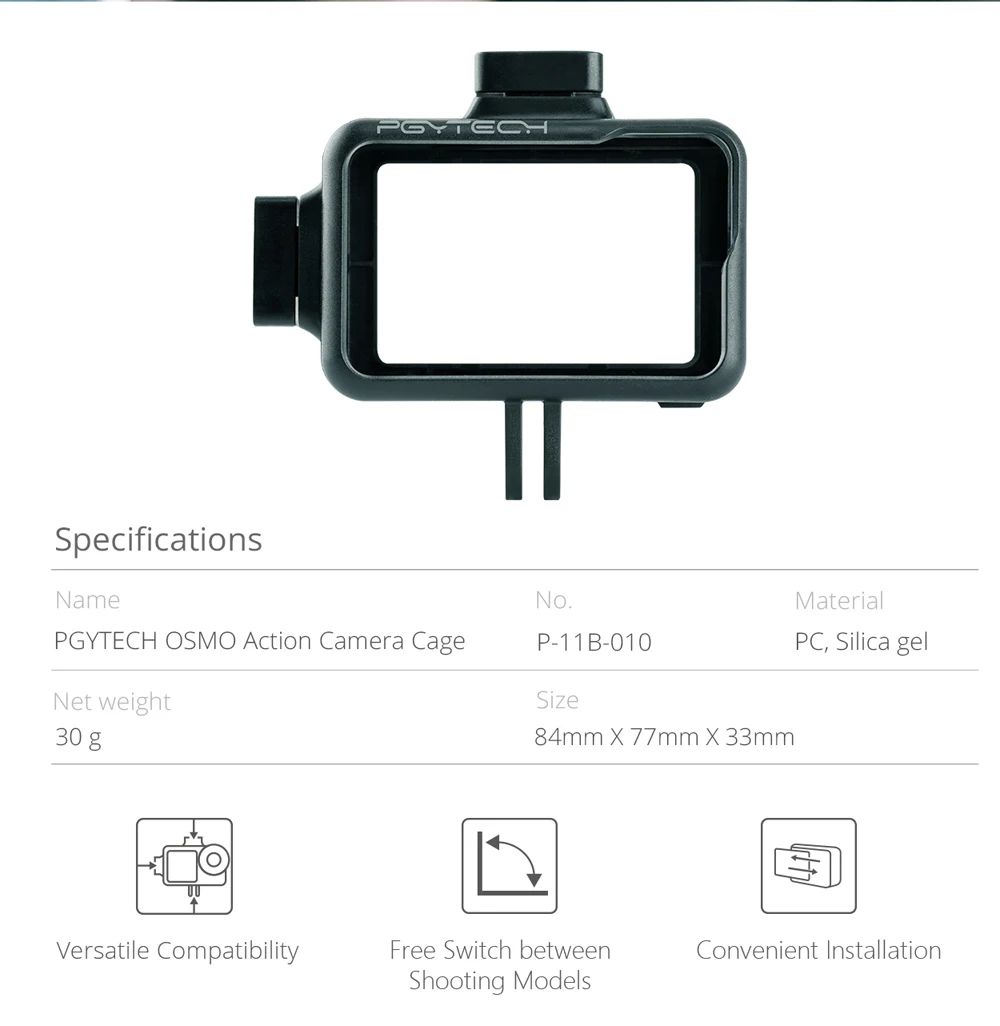 Название PGYTECH OSMO клетка для экшн-камеры Вес нетто 30 г Без P-11B-010 Материал: Поликарбонат, силикагель Размер 84 мм × 77мм 33 мм