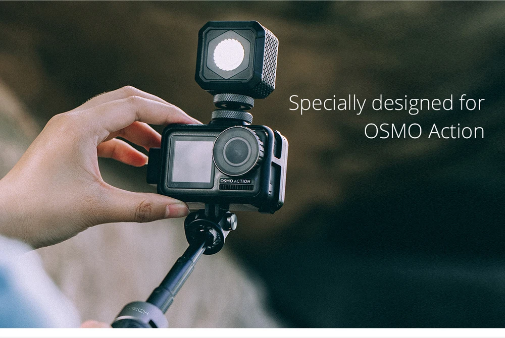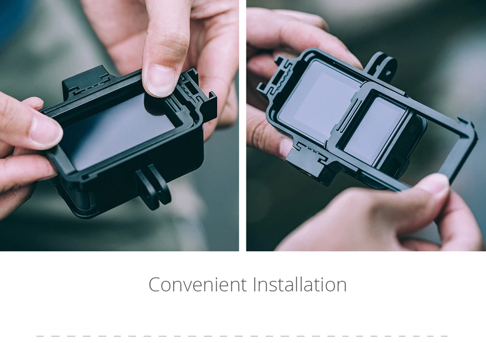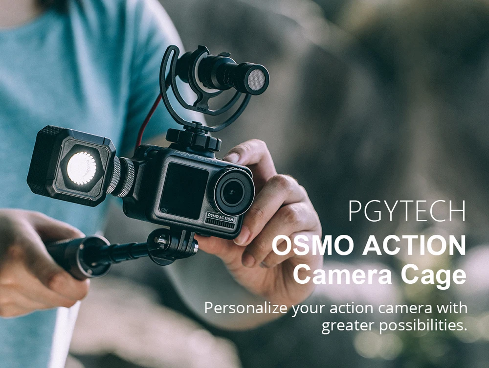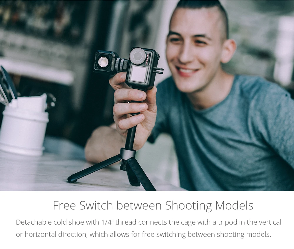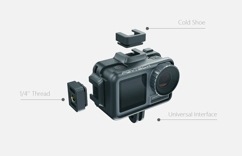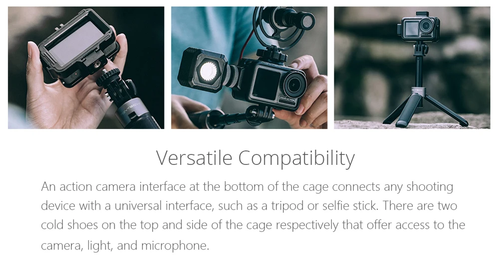 Интерфейс экшн-камеры в нижней части клетки соединяет любое устройство для съемки с универсальным интерфейсом, таким как штатив или селфи-палка. В верхней и боковой частях клетки есть две холодные туфли, которые обеспечивают доступ к камере, светильник и микрофон.