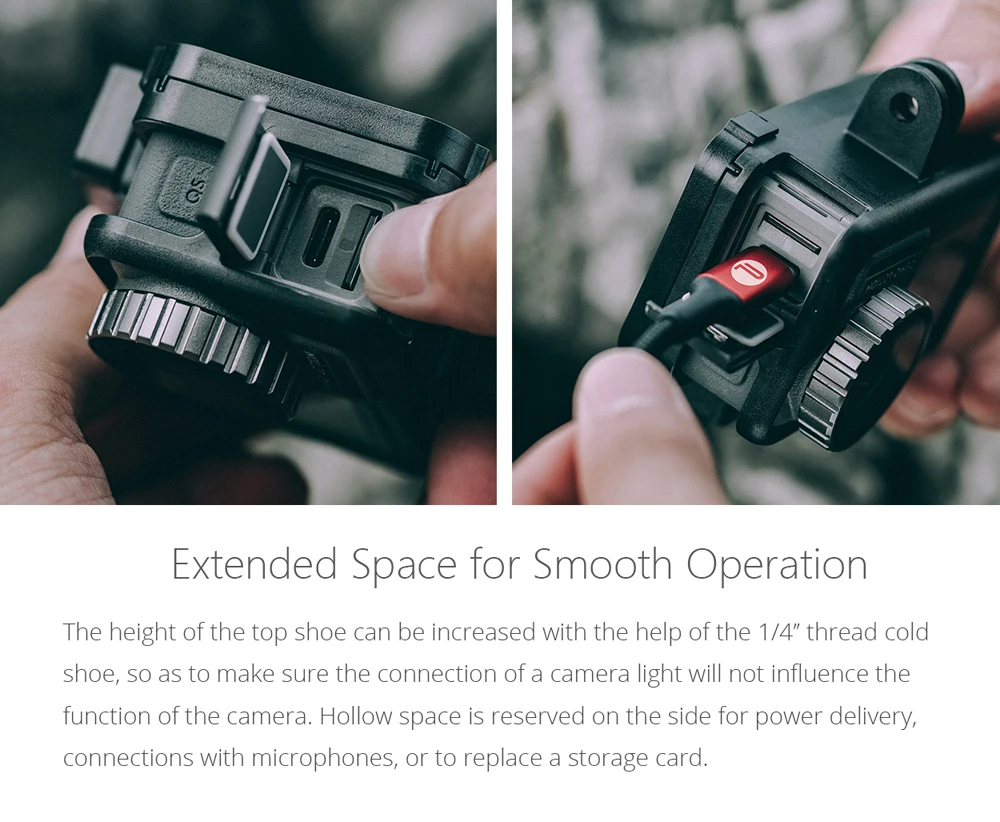 Высота верха обуви может быть увеличена с помощью 1/4 "нить Холодный башмак, чтобы убедиться, что светильник камеры не повлияет на функцию камеры. Полые пространства защищены на стороне для подключения питания с микрофонами или для замены карты памяти.