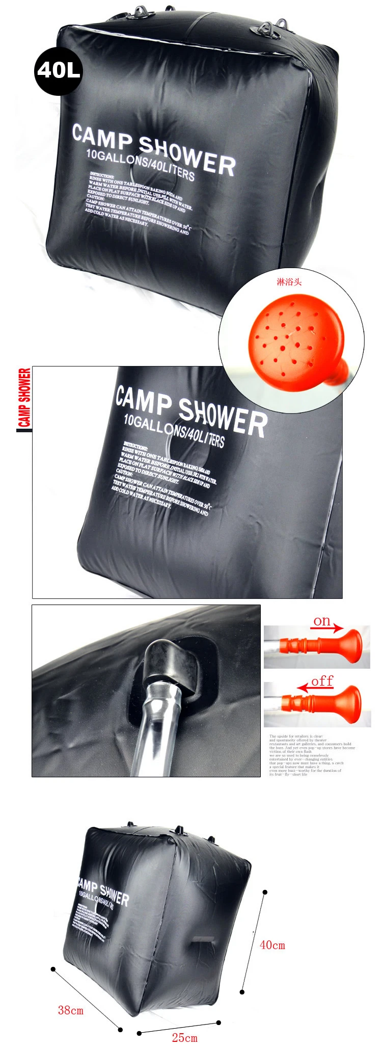 Характеристика: Для удержания 20 л воды достаточно промыть ванну в течение 8-9 минут (40 л в течение 10 минут). Солнечная энергия нагревает воду до 86F °(30 °C) в течение 3 часов с прямыми солнечными лучами. Удобный клапан вкл/выкл соединен с душевой головкой и удобен в управлении. Крепкая ручка надежная, чтобы повесить на ветку или планку. Спецификация: Материал: ПВХ Емкость: 20 л/40 л (опционально) Вес: 330-470 г/11,6-16,5 унций Вес посылка: 410-540 г/0,9-1.1lb Посылка Размер: 31*15,5*5 см/12,2*6,1 * 2.1in Посылка: 1 * сумка для душа 1 * трубка с насадкой для душа 1 * подвесная веревка