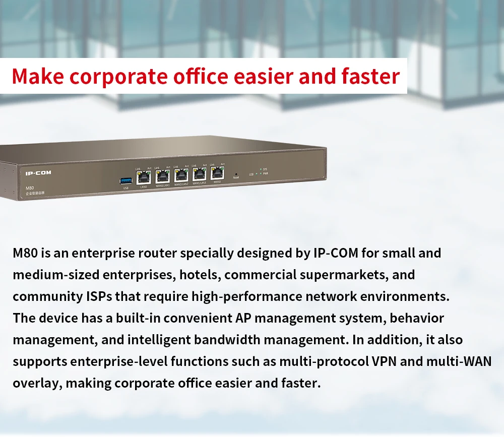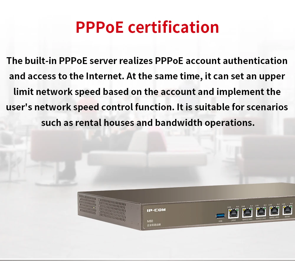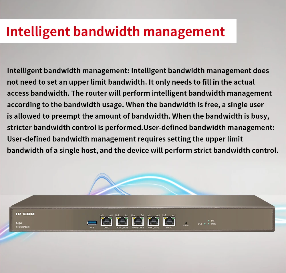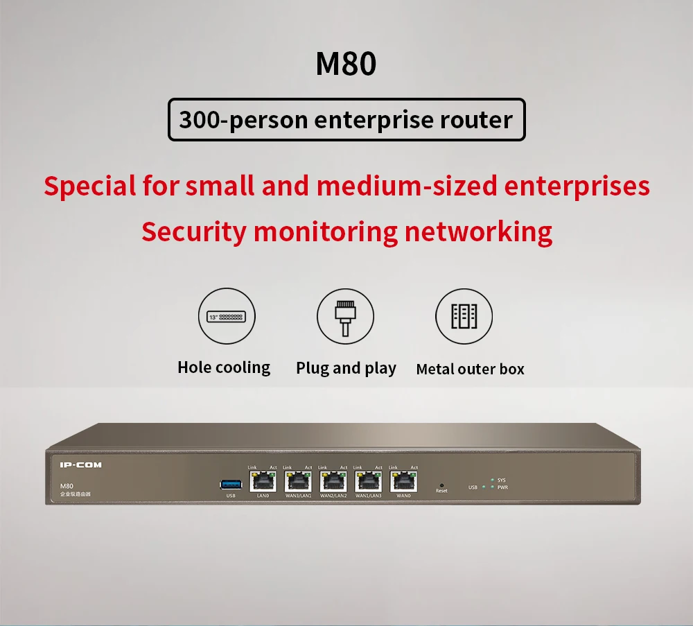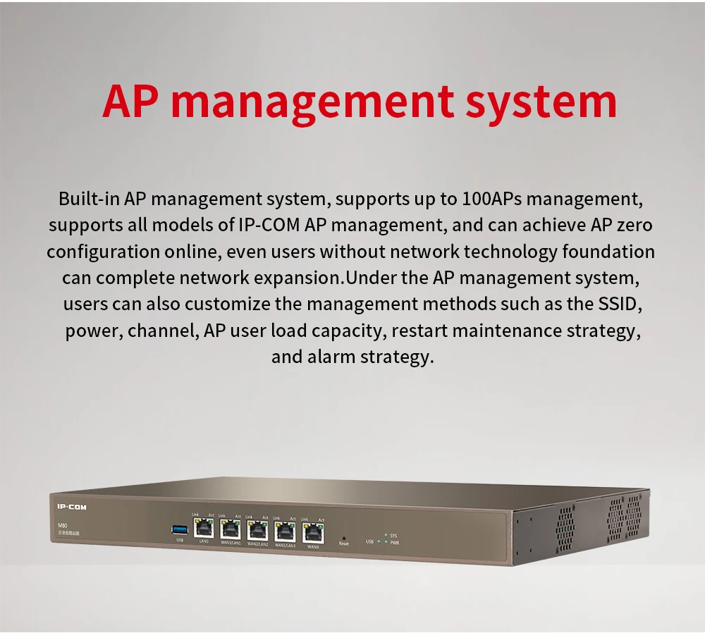 ARM двухъядерный 1,4 ГГц сетевой процессор, максимальная пользователей может быть 300 5*10 \ 100 \ 1000 Мбит/с сетевой порт, 1 * USB интерфейс Он может управлять IP-COM всеми AP, поддерживает максимальное управление 100AP, поддерживает автоматизацию конфигурации Встроенная веб-аутентификация с одним ключом, аутентификация паролем веб-учетной записи, аутентификация WeChat SMS аутентификация и другие методы аутентификации Поддержка QVLAN, максимальная настраиваемая 15 QVLAN