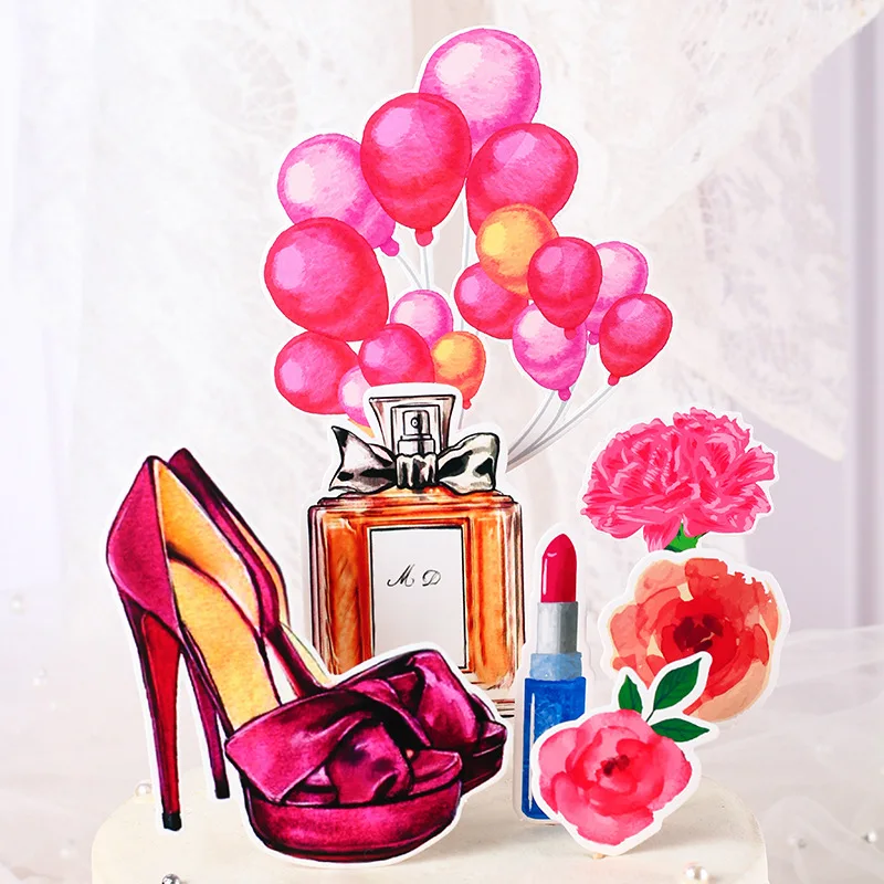 Духи губная помада макияж кисти Торт Топперы кекс «сделай сам» Топпер женщины флажки для торта дети девушка С Днем Рождения невесты вечерние украшения для выпечкиОписание: