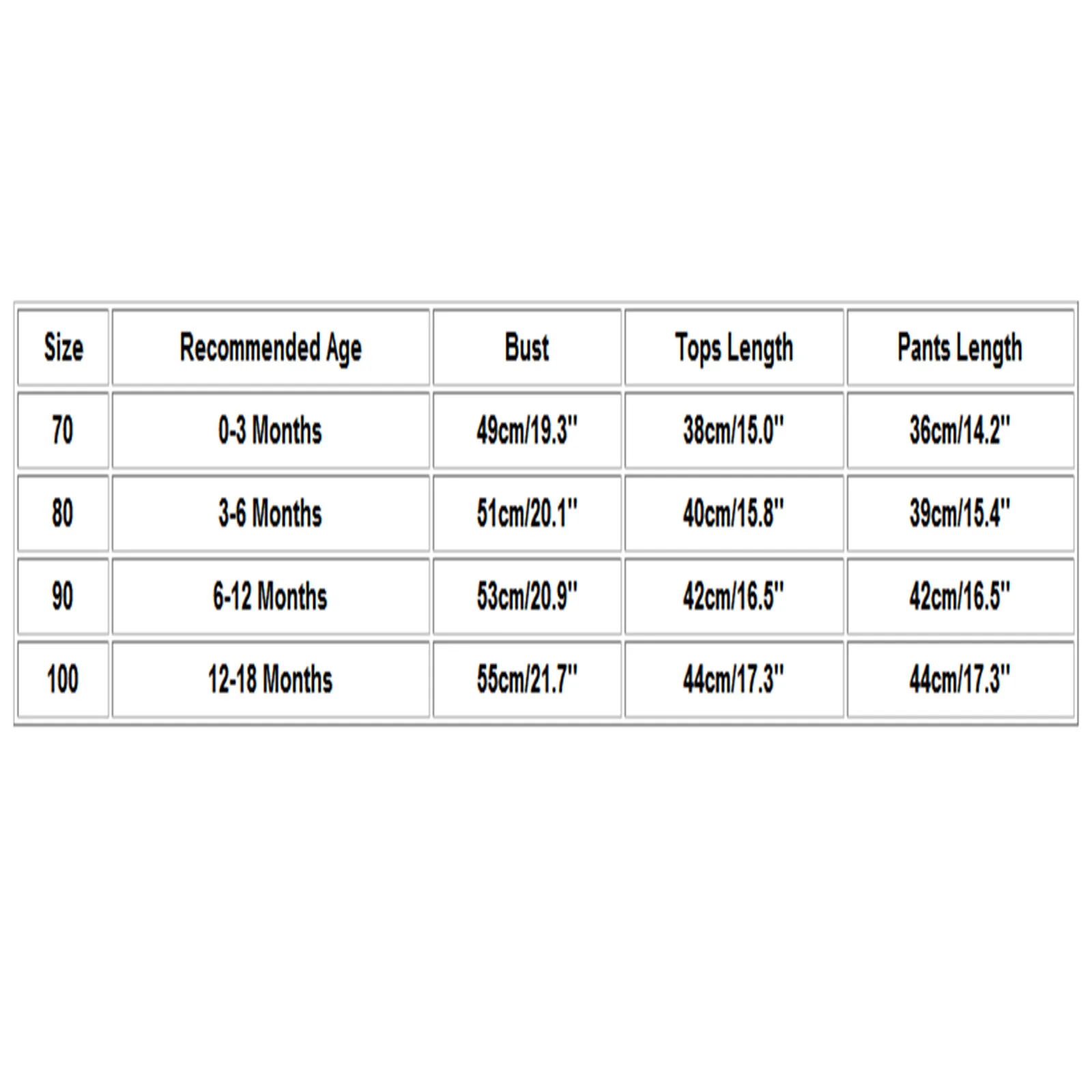 Размер Рекомендуемый возраст Бюст Длина топа Длина брюк 70 0-3 месяца 49 см/19,3'' 38 см/15,0'' 36 см/14,2'' 80 3-6 месяцев 51 см/20,1'' 40 см/15,8'' 39 см/15,4'' 90 6-12 месяцев 53 см/20,9'' 42 см/16,5'' 42 см/16,5'' 100 12-18 месяцев 55 см/21,7'' 44 см/17,3'' 44 см/17,3''