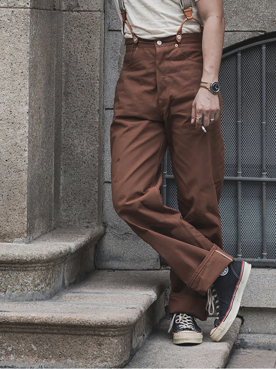 На основе 1-го медного клепки рабочие брюки, так называемые 1873 утка холщовые рабочие брюки, используйте двойной warp холст.