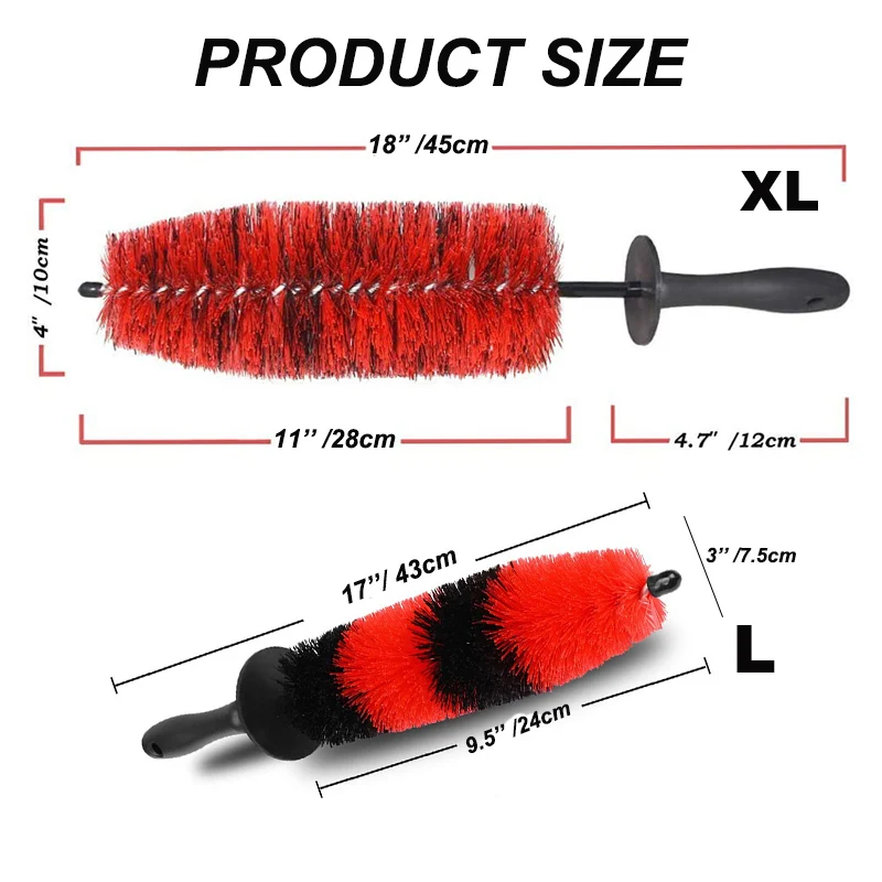Вопрос 1:18 дюймов длинные колесная щетка (S, M, L, XL) Материал: мягкая щетина + ручка PP Размер: XL:18 дюймов * 4 дюйма (45*10 см) Вес: 285 г/шт. Цвет: красный Вопрос 2:17 дюймов колесная щетка (L) Материал: мягкая щетина + ручка PP Размеры: XL:17 дюймов * 3 дюймов (43*7,5 см) Вес: 185 г/шт. Цвет: красный + черный