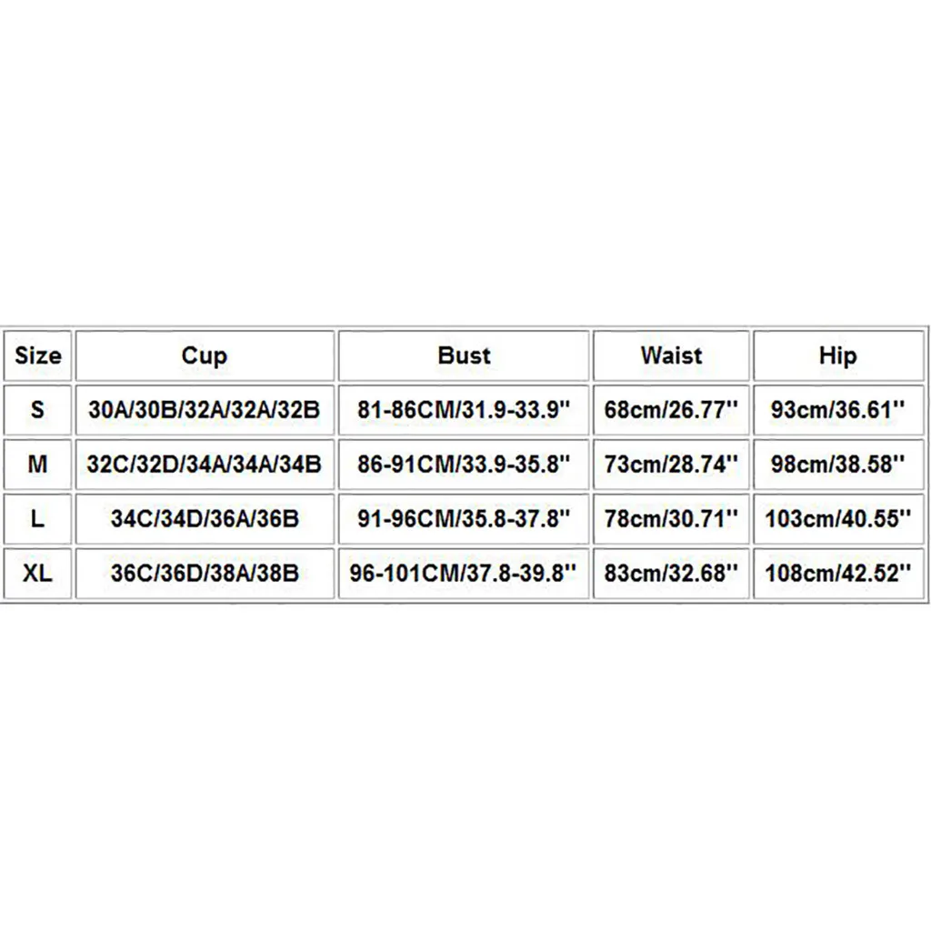 Примечание: Пожалуйста, сравните детали размеров с вашими перед покупкой! Используйте аналогичную одежду, чтобы сравнить с размеромРазмер Чашка Бюст Талия Бедра S 30A/30B/32A/32A/32B 81-86 см/31,9-33,9" 68 см/26,77'' 93 см/36,61'' М 32C/32D/34A/34A/34B 86-91 см/33,9-35,8" 73 см/28,74'' 98 см/38,58'' L 34C/34D/36A/36B 91-96 см/35,8-37,8" 78 см/30,71'' 103 см/40,55'' XL 36C/36D/38A/38B 96-101 см/37,8-39,8'' 83 см/32,68'' 108 см/42,52''