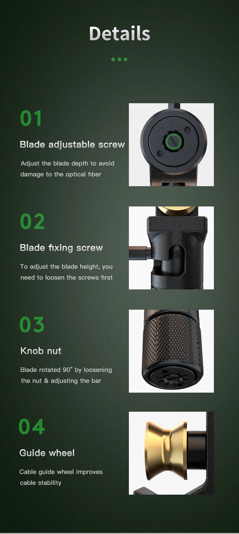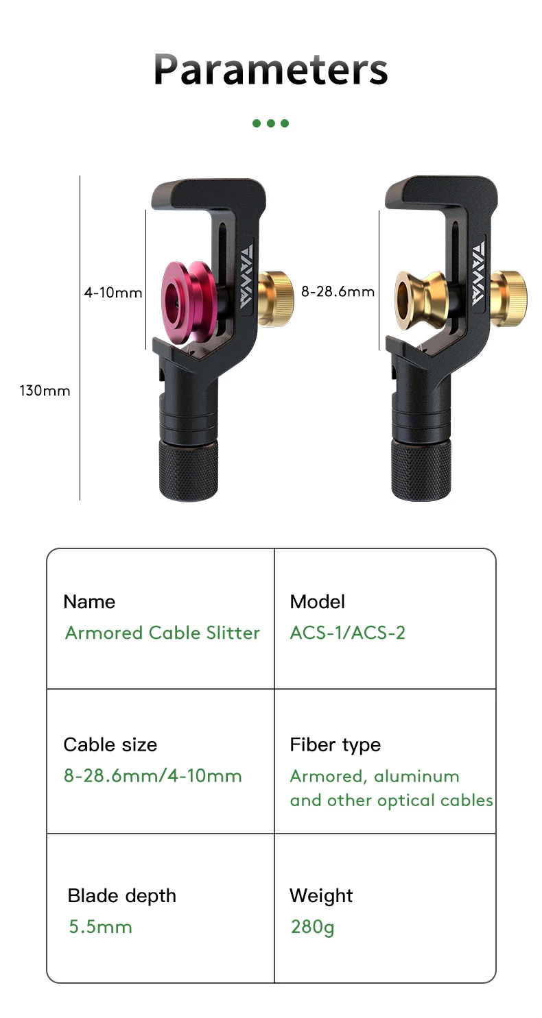 Серия ACS бронированные Кабельные фрезы подходят для мульти-coreoptical кабелей с рукавами или бронированных оболочек. Бронированная оболочка внешнего слоя оптического кабеля быстро разделяется, чтобы получить Оптическое волокно внутри. Он может отрезать продольно и циркулярно, а высота лезвия также может быть скорректирована в соответствии с требованиями. Конструкция направляющего колеса делает зачистки быстрыми. Он может разрезать внешнюю полиэтиленовую куртку и броню шаг за шагом, чтобы избежать повреждения оптического волокна.