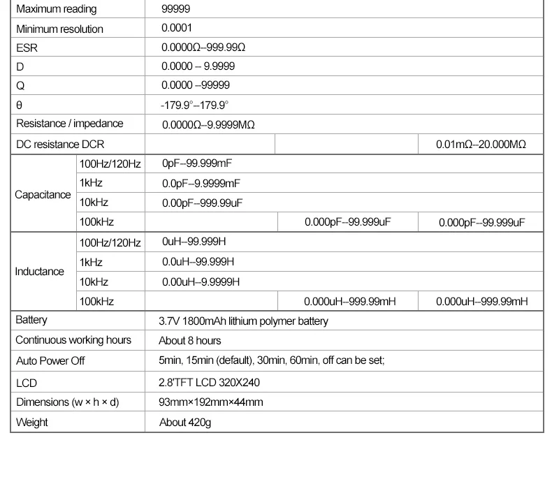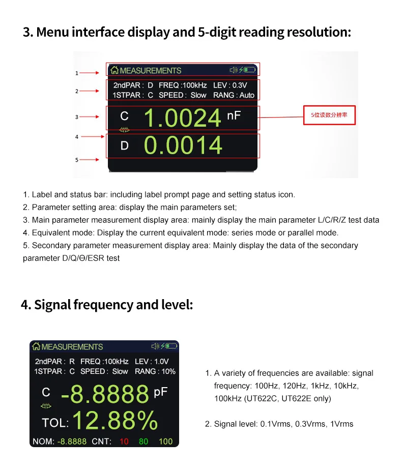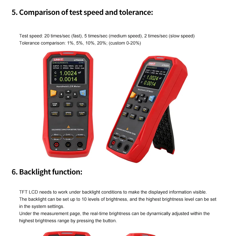UT622 серия LCR digital bridge-это удобный ручной измерительный прибор для измерения индуктивности, емкости, сопротивления и других параметров компонентов. Он питается от li-ion 3,7 в 1800 мАч литий-полимерная батарея или внешний адаптер питания. Может использоваться в настольных приложениях. Частота, параметры и скорость прибора выбираются немедленно нажатием; В то же время он также имеет режим допуска для сортировки компонентов, и режим записи может помочь в получении показаний; простая в эксплуатации функция открытого замыкания и короткого замыкания Улучшает точность измерений; Практическое меню конфигурации можно установить фиксированный тон ключа, автоматическое выключение и другие операции.