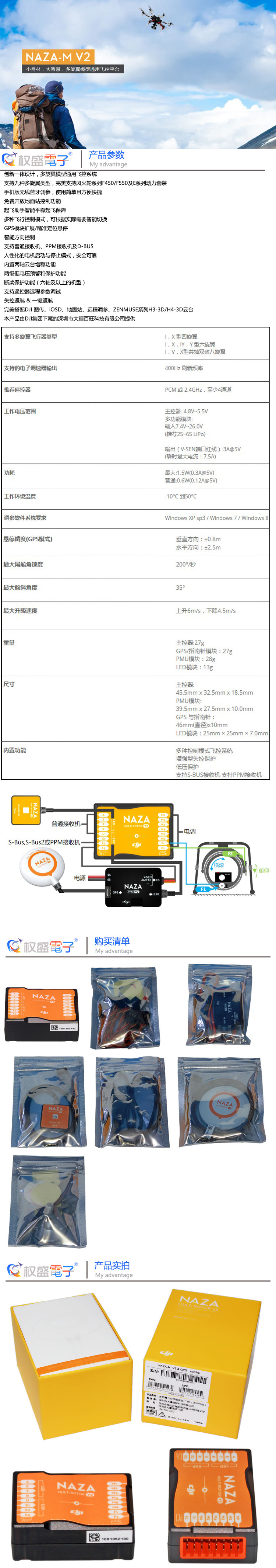 Характеристики: все-в-одном дизайн придерживается непрерывной инновации и улучшения, с новой прошивкой, новым алгоритмом стабилизации отношения и оптимизированной аппаратной структурой, Naza-M V2 обеспечивает лучшую производительность полета. Инновационный дизайн «Все в одном» упрощает установку и экономит пространство и вес. Он содержит внутреннее демпфирование, контроллеры, 3-осевым гироскопом, 3-х осевой акселерометр и барометр в своем светильник и небольшой главный контроллер. Он может измерять высоту полета, отношение и поэтому используется для автопилота/автоматического управления. Независимый PMU с потрясающим расширением функций Naza PMU V2 имеет расширенную функциональность BEC и обеспечивает расширенные порты CAN BUS, которые могут поддерживать iOSD, Zenmuse H3-2D gimbal (управление шагом). Поддержка также включена в дополнительный светодиодный модуль Bluetooth для настройки параметров через мобильное приложение (для этого требуется обновление прошивки в будущем) усовершенствованный и улучшенный алгоритм стабилизации отношения новейший алгоритм стабилизации отношения четвертого поколения не только наследует выдающуюся стабильность полета продуктов, но и обеспечивает отличную маневренность даже без модуля GPS. Он более гибкий и стабильный, и дает любителям прекрасный опыт полета. Новые функции были включены, такие как Автоматическая компенсация gps-курса, калибровка датчика GPS и компаса, новый режим взлета и так далее. Девять типов многороторов поддерживаются Naza-M V2 теперь поддерживают девять типов многороторов, которые отвечают различным потребностям энтузиастов. Quad I, Quad X; Hexa I, Hexa V, Hexa Y, Hexa IY; Octo X, Octo I, Octo V; ( Naza-M V2 не поддерживает самолет с большой вибрацией, поэтому, когда вы выбираете использовать гекса-ротор или окто-ротор, Пожалуйста, обратите внимание на вибрацию и попытайтесь сделать некоторые вибрации увлажнения); Несколько режимов управления полетом/интеллектуальное переключение он предлагает три типа режимов управления: GPS Atti. Режим (с GPS модулем), Atti. Режим, ручной режим. Пилот может переключаться между тремя режимами для достижения различных характеристик полета. Он также может автоматически регулироваться в среде полета и умно переключаться между GPS Atti. Режим и Atti. Режим, чтобы убедиться, что полет безопасен и безопасен. В программном обеспечении в положении ручного режима вы можете выбрать руководство, отношение или безотказную безопасность; Он поддерживает один ключ безотказный триггер. Gps-модуль доступен/точное положение удерживает Модуль plug and play GPS значительно улучшит производительность аэрофотосъемки с фиксацией положения, функциями управления возвратом в дом и умной ориентацией. С модулем GPS мульти-ротор будет иметь положение и высоту заблокированы даже в ветреных условиях. Зависания точность определения его местонахождения составляет approximatley 2,5 м по горизонтали и 0,8 м вертикальный. Интеллектуальное управление ориентацией обычно, направление вперед летающего мульти-ротора такое же, как направление носа. Используя интеллектуальное управление ориентацией (IOC), где бы ни находились точки носа, направление движения вперед не имеет ничего общего с направлением носа: Конечно, блокировка полета, направление вперед такое же, как фиксированное направление носа. См. Следующие цифры (режим 2) в полете блокировки дома,