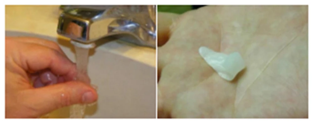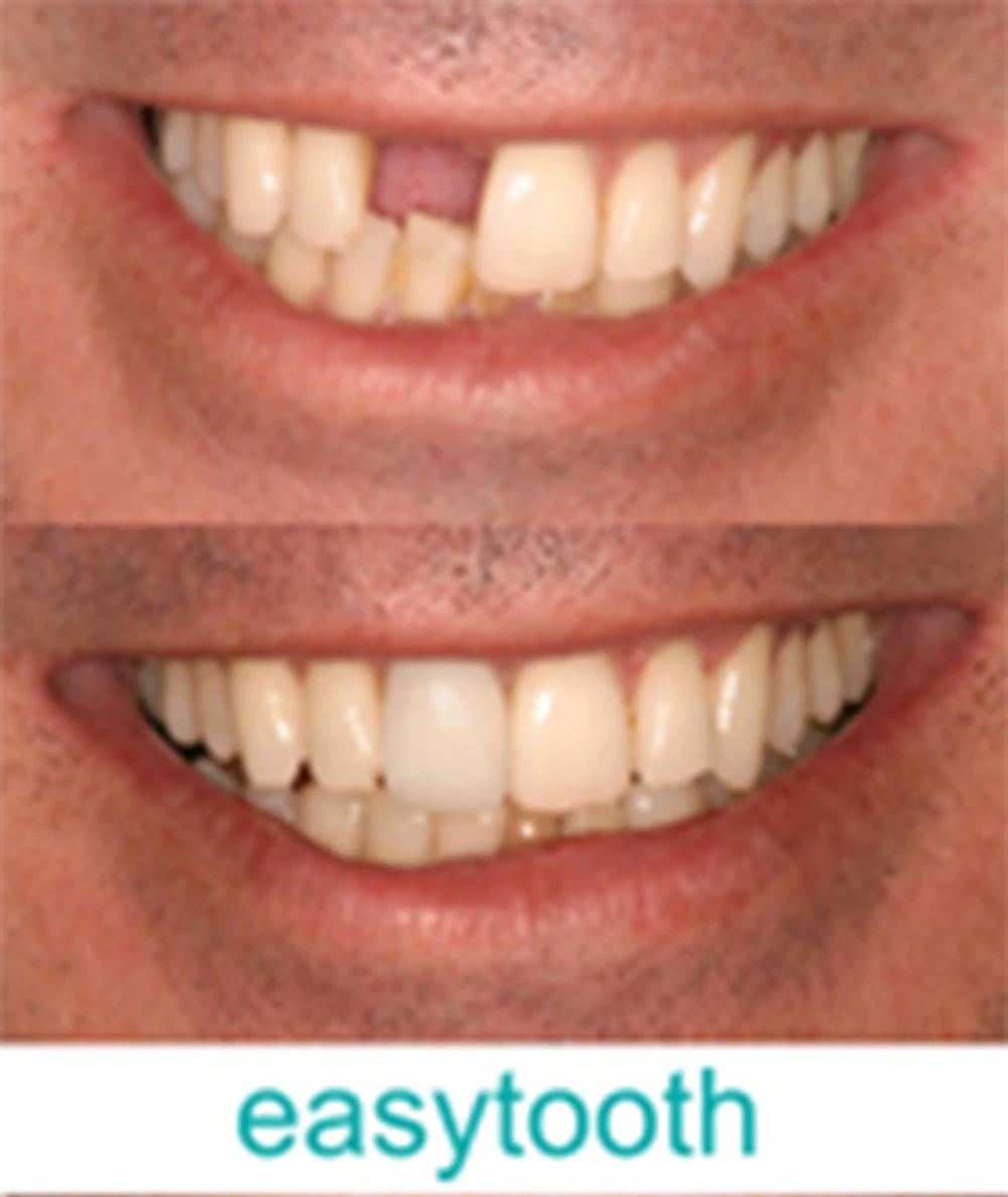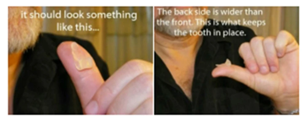Теперь пропустите холодную воду над новым зубом, чтобы затвердеть пластик. Ваш новый зуб станет белым по мере охлаждения и начнет выглядеть как на рисунке ниже (справа).