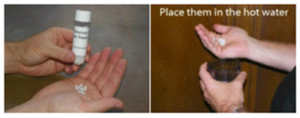 Сначала нужно нагреть около половины чашки воды до почти кипения. На плите нужно остановиться как только вода начнет пузыриться. Если вы используете микроволновую печь, это займет примерно минуту-полторы минуты. (Этот специализированный пластик плавится при температуре 60 °C.) Далее нужно взять около 15 пластиковых бусин (больше для зуба большего размера), и поместить их в горячую воду.