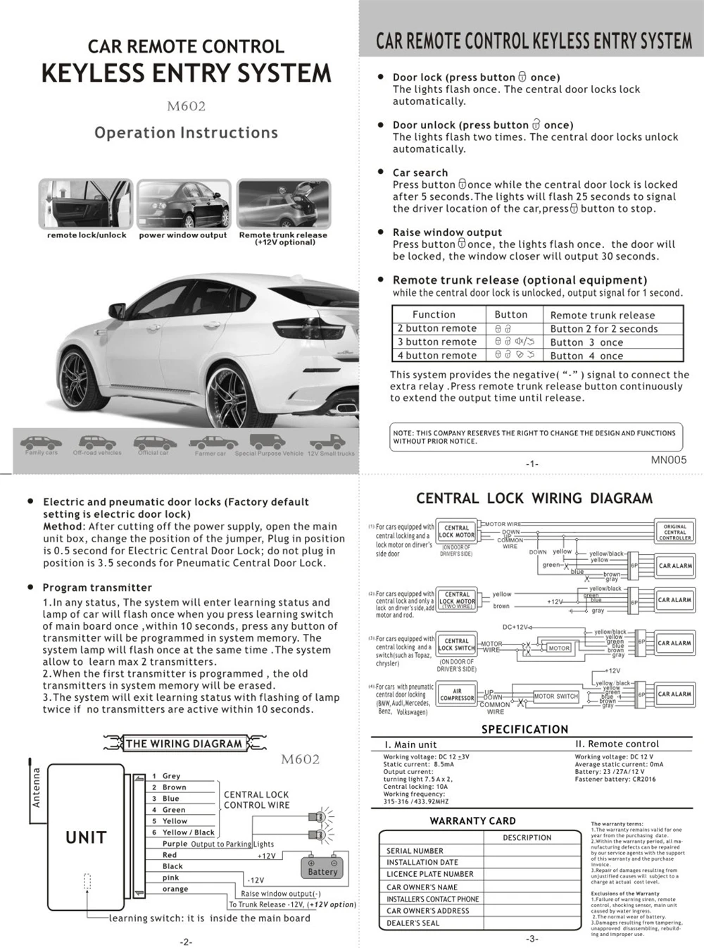 Специальная функция: блокировка, разблокировка, локатор автомобиля (положение поиска), выход сигнала окна, выпуск багажника (-)