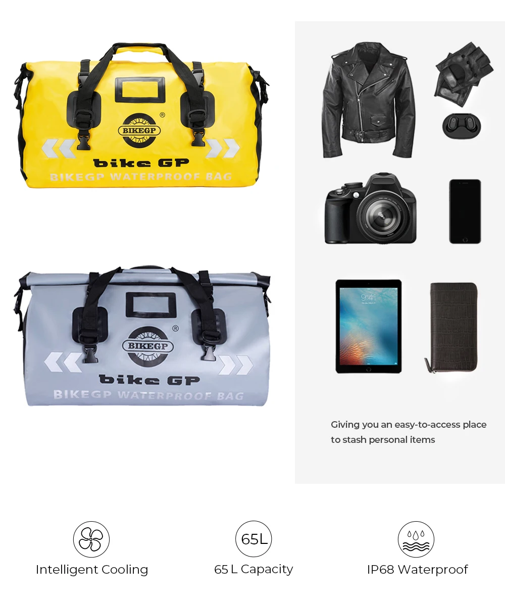 [Большая вместимость и фиксация]-он может держать тяжелые зимние теплые предметы, такие как шлемы, пуховики, ветрозащитные куртки, перчатки и шляпы. Ролик мотоцикла поставляется с 2 затягивающимися ремнями и эластичными бретели с крючками, которые обеспечивают Якорные точки при гребле, каякинге, рафтинге или езде на мотоцикле, которые могут быть заблокированы.
