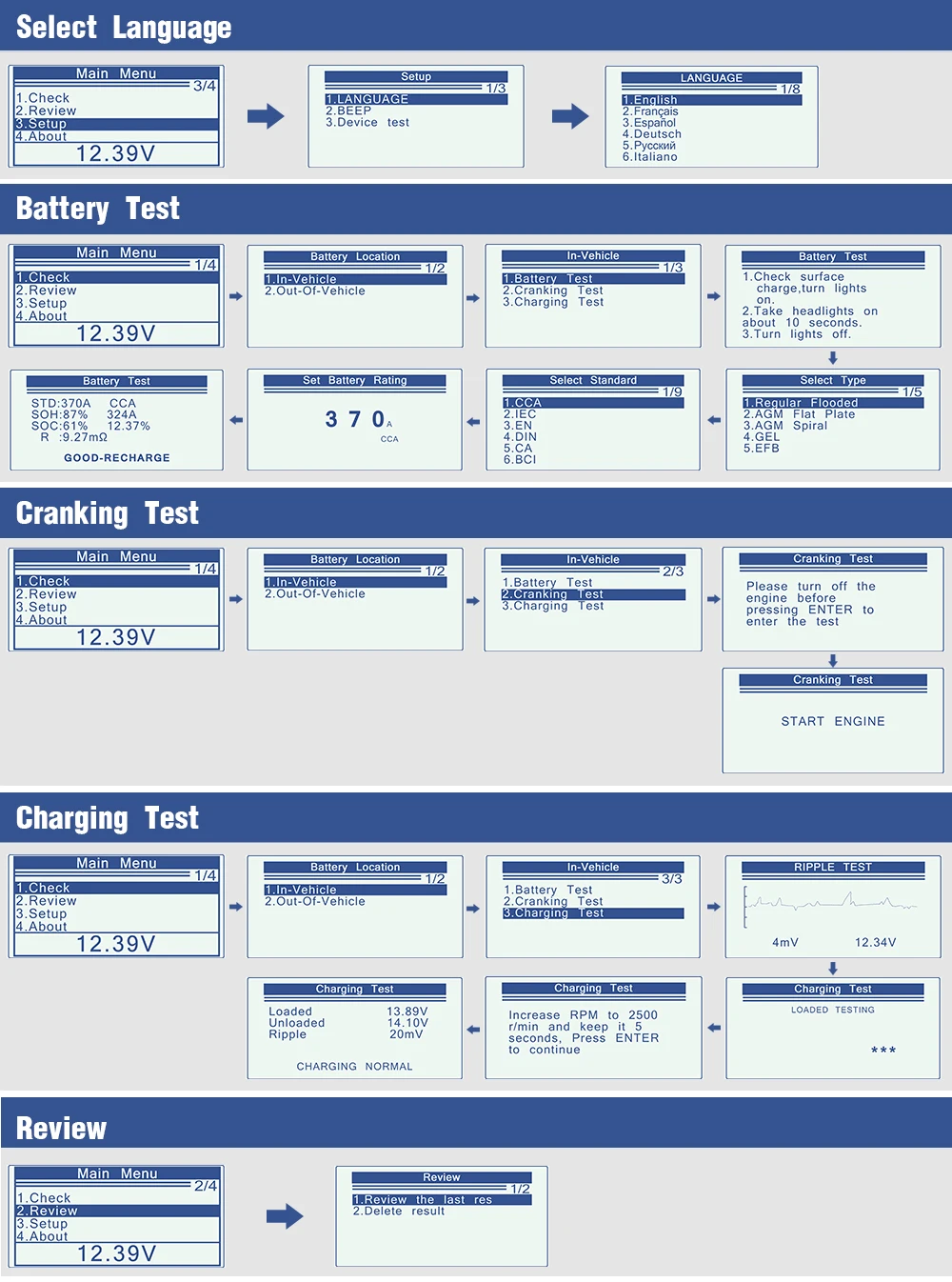 Тест батареи, тест на проворот коленвала, тест зарядки и другие дополнительные функции