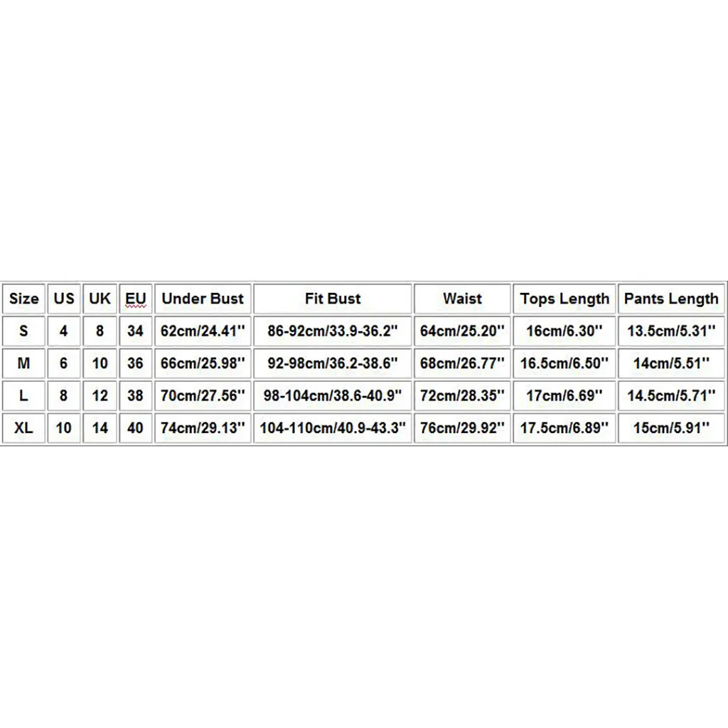 Размеры США Великобритания ЕС Под грудью Облегающий бюст Талия Длина топа Длина брюк S 4 8 34 62 см/24,41 дюйма 86-92 см/33,9-36,2" 64 см/25,20 дюйма 16 см/6,30 дюйма 13,5 см/5,31 дюйма М 6 10 36 66 см/25,98 дюйма 92-98 см/36,2-38,6" 68 см/26,77 дюйма 16,5 см/6,50 дюйма 14 см/5,51 дюйма L 8 12 38 70 см/27,56 дюйма 98-104 см/38,6-40,9" 72 см/28,35 дюйма 17 см/6,69 дюйма 14,5 см/5,71 дюйма XL 10 14 40 74 см/29,13 дюйма 104-110 см/40,9-43,3" 76 см/29,92 дюйма 17,5 см/6,89 дюйма 15 см/5,91 дюйма