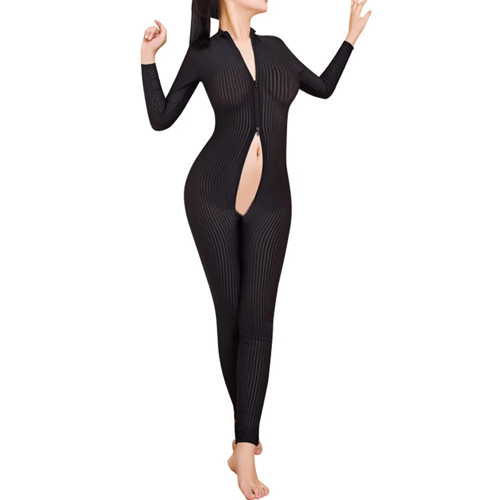 Женское Полосатое сексуальное боди на молнии с длинным рукавом, открытая промежность, нижнее белье, комбинезон