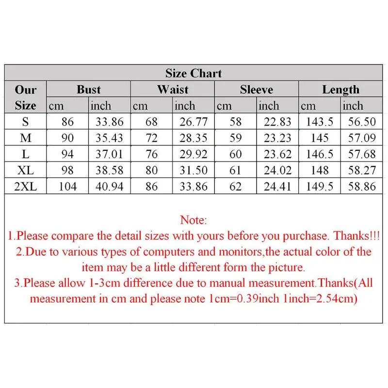Размер: 2XL Обхват груди: 104 см (40,94 дюйма) обхват талии: 86 см (33,85 дюйма) рукав: 62 см (24,41 дюйма) Длина: 149,5 см (58,85 дюйма)
