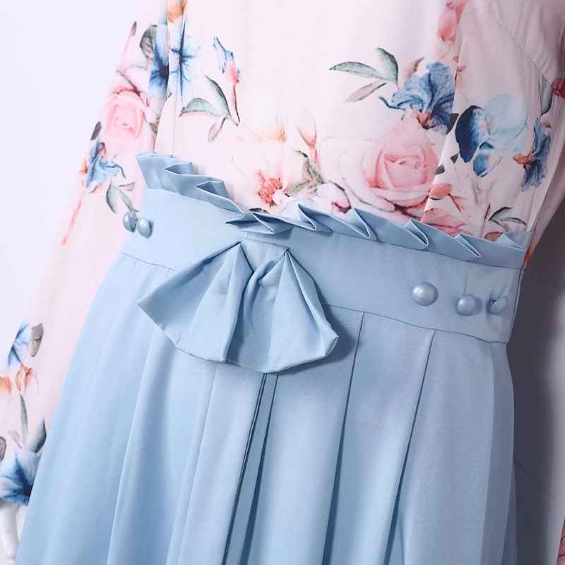Длинные рукава, контрастный топ с цветочным принтом. Высокая Талия на резинке с оборками. На талии украшен бантом. Однотонная юбка макси.