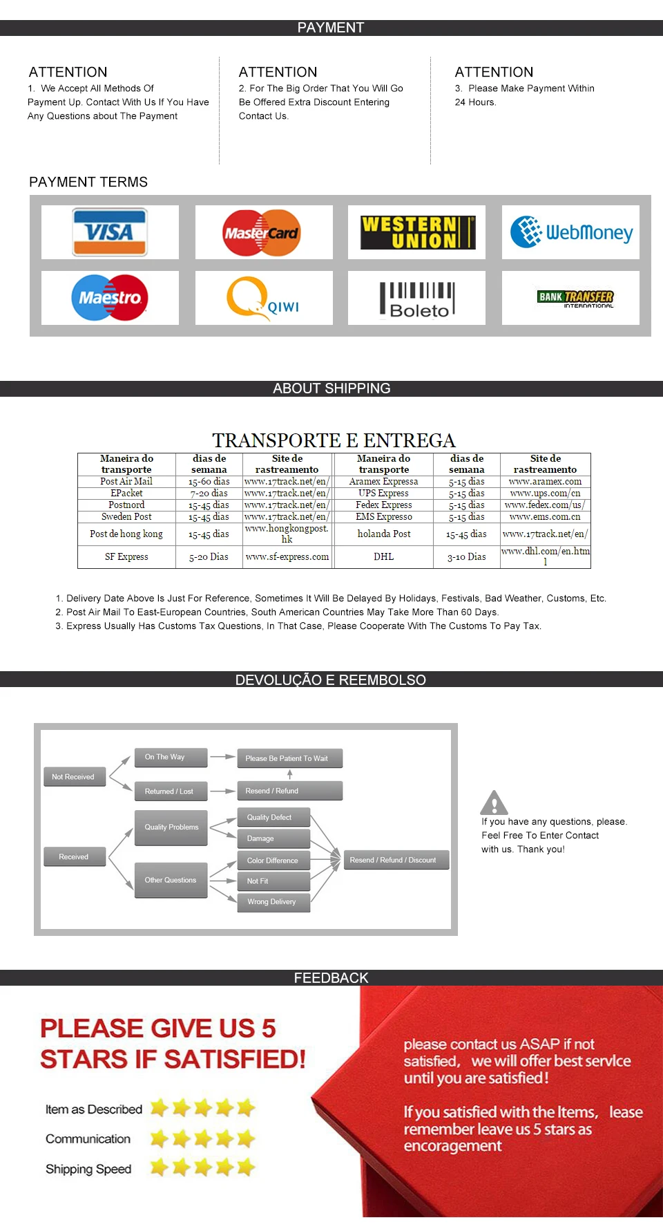О доставке 1. Заказы обрабатываются в течение 1-5 дней после оплаты и проверки. 2. Почта Китая обычный маленький пакет плюс без международного номера отслеживания, который не может быть отслежен, когда посылка покидает Китай. 3. Для более быстрой и безопасной доставки мы рекомендуем вам выбрать доставку через Почта Китая заказной авиапочтой, ePacket или AliExpress 4. Мы организуем доставку в соответствии с адресом, который предоставляет покупатель, поэтому, пожалуйста, подтвердите и проверьте адрес, который вы указали на Aliexpress. 5. Если вы не получили товар в течение 60 дней, пожалуйста, свяжитесь с нами. Мы проверим его для вас. О отзывы 1. Ваше удовлетворение и положительные отзывы очень важны для нас. 2. Пожалуйста, оставьте положительный отзывы и 5 звезд, если вы удовлетворены товарами. Мы будем признательны, если вы можете разместить фотографии товаров. 3. Если у вас есть какие-либо вопросы о продуктах или наших услугах, пожалуйста, свяжитесь с нами, прежде чем оставлять негативные отзывы. Мы сделаем все возможное, чтобы решить любые вопросы и предоставить Вам лучшее обслуживание клиентов. О возврате и возврате 1. Пожалуйста, свяжитесь с нами перед возвратом дефектного или неправильного товара. 2. Пожалуйста, храните возвращенный товар в неиспользованном состоянии и храните оригинальную упаковку, включая коробку и бирки. 3. Пожалуйста, верните бракованный или неправильный товар в течение 7 дней после его получения. 4. Мы не допускаем возврат средств или обмен из-за изменений и стоимость доставки не возвращается.