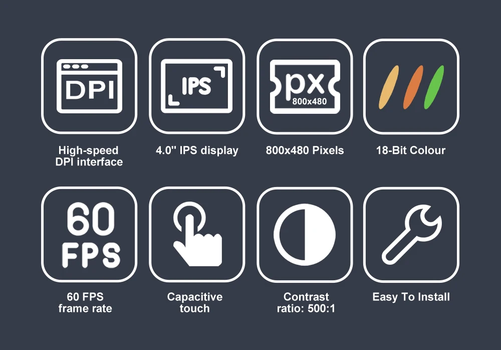 Список посылка CTP40 LCD * 1 2,54 мм 2x20 ряд муфтовый стыковочный переводник * 1 M2.5 H15 мм разделитель * 4 M2.5 H4 мм разделитель * 4 M2.5 * 5 винт * 4 Характеристика Высокоскоростной интерфейс DPI 4,0 «IPS (широкий обзор угол, 160 °) отображением значений (86,4x51,8 мм) 800x480 пикселей (~ 235 PPI) 18-битный цвет (262144 цветов)/18(26) Частота кадров 60 кадров в секунду/60 Контрастность: 500:1 Емкостный сенсорный экран 5V @ 3A DC-DC на борту (9-28V вход)/5V/3A DC-DC(28V) 40-контактный наружный коллектор в комплекте/40pin Стойки в комплекте Совместим со всеми 40-штыревой разъём Raspberry Pi модели/40pin Простота установки