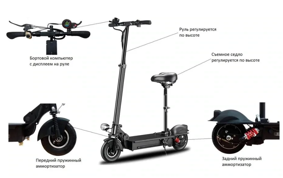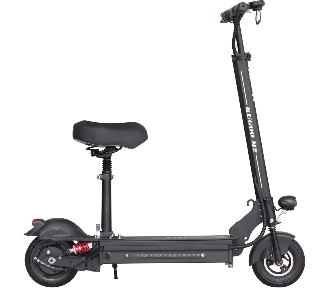 Электросамокат Kugo M2 уникален тем, что при своей небольшой цене, он имеет съемное сиденье в комплекте, надувные колеса и аммортизаторы.