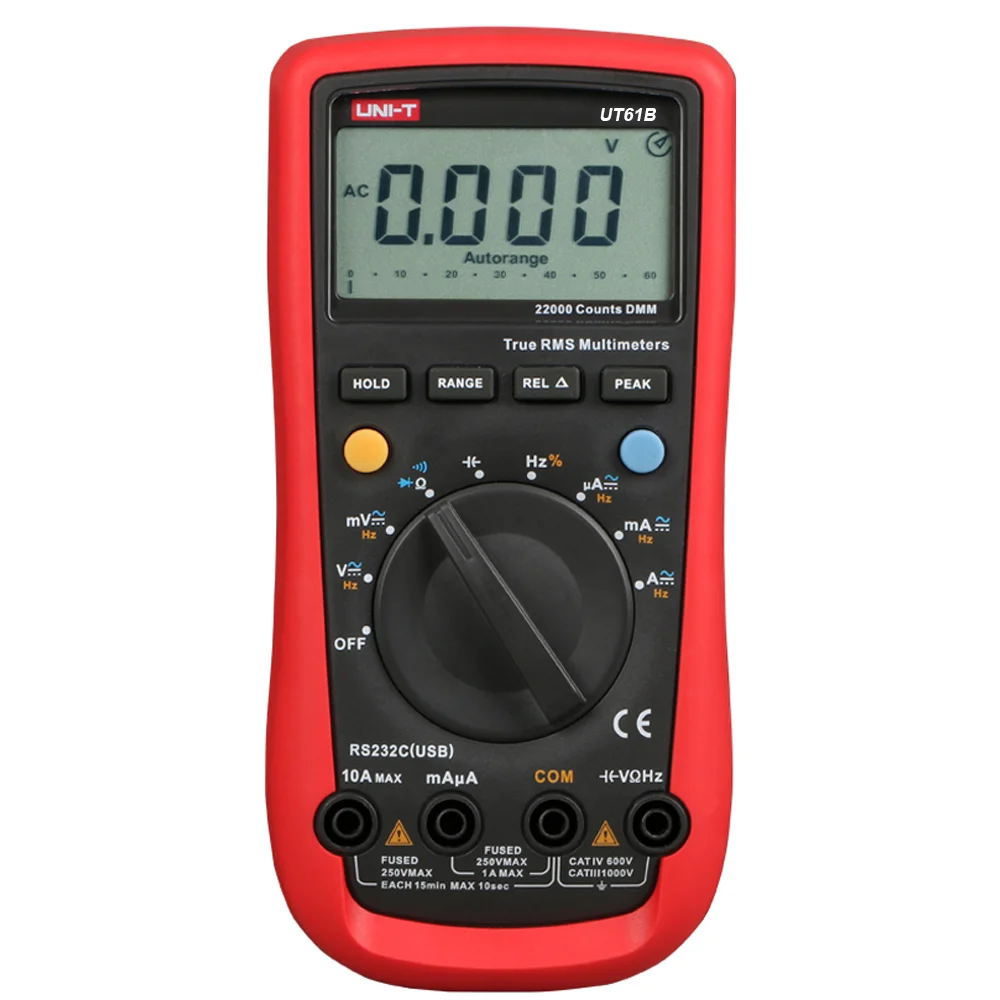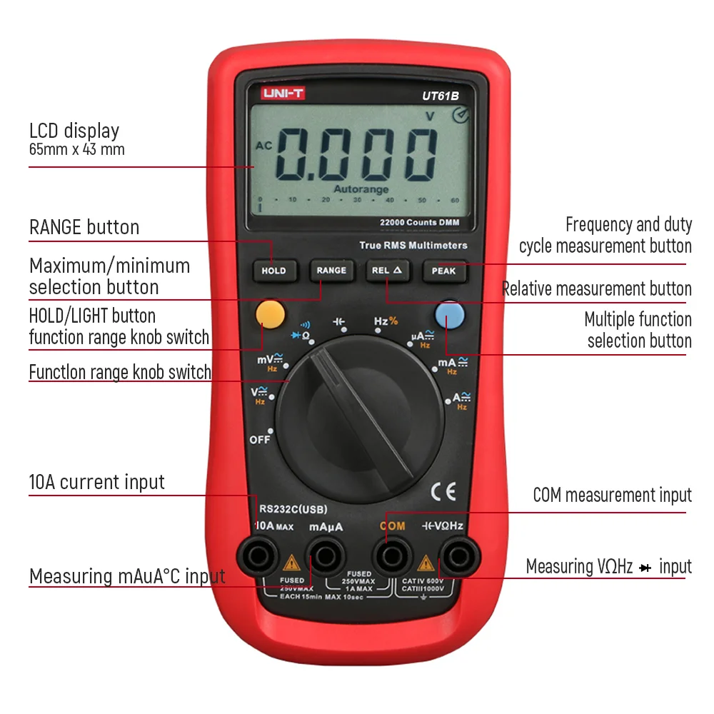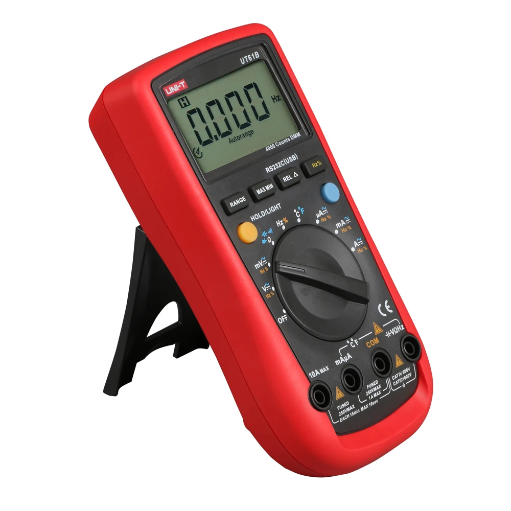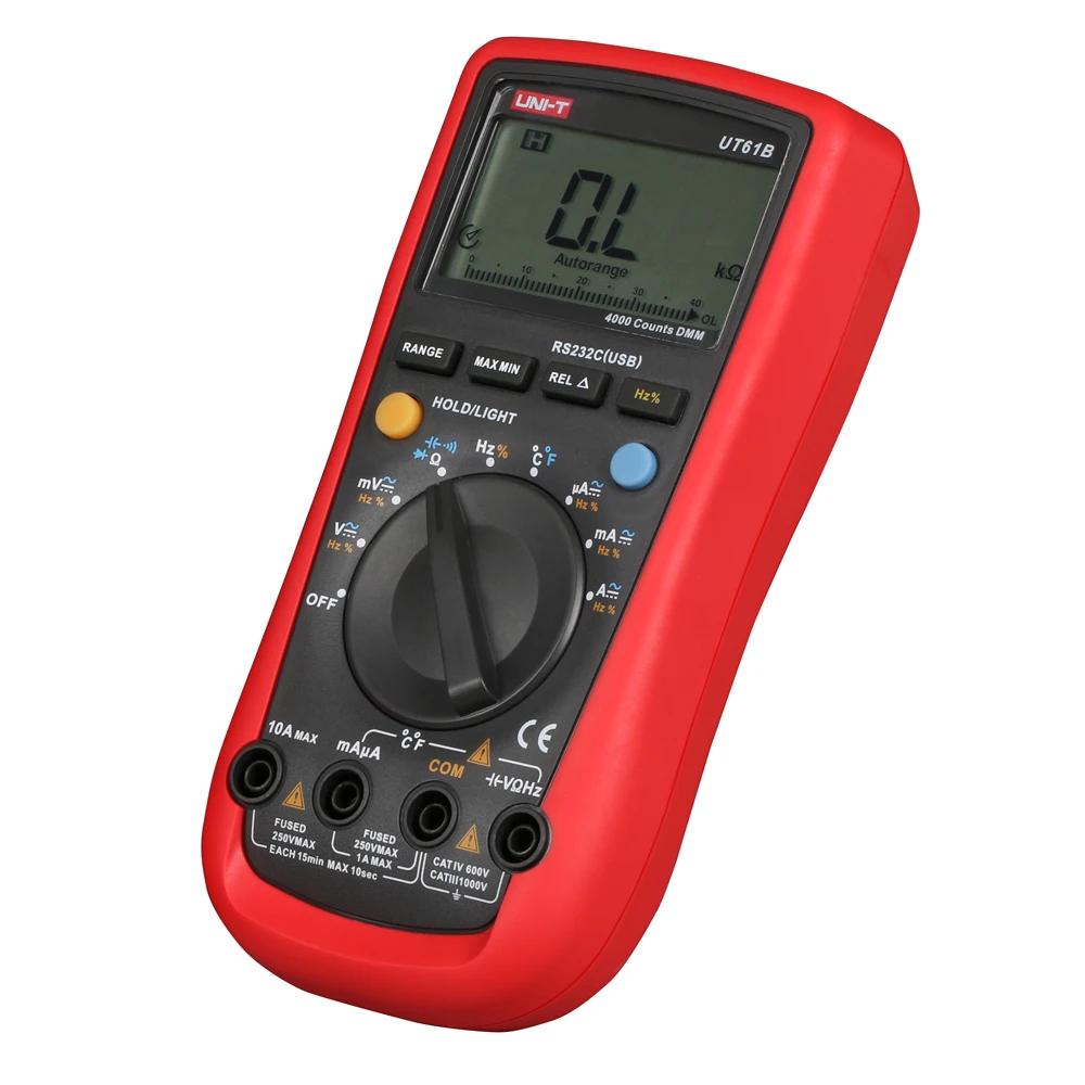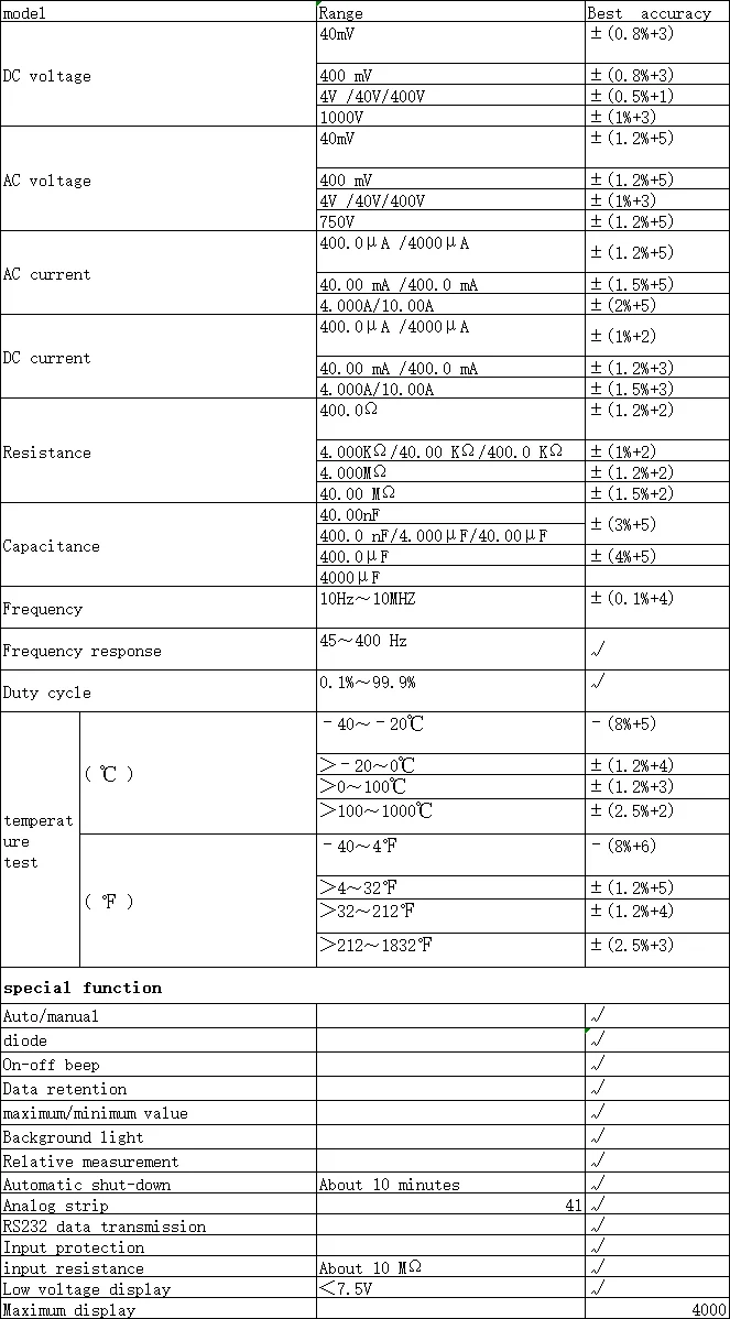 Особенности: 1. Автоматический диапазон 2. Макс/мин/режим REL 3. Автоматическое выключение питания 4. ЖК-подсветка 5. RS-232 и usb-интерфейс 6. Аналоговый бар 7. Индикация низкого заряда батареи 8. Датчик температуры k-типа 9. Диод/Непрерывный зуммер 10. Хранение данных 11. Входная защита 12. Рабочий цикл